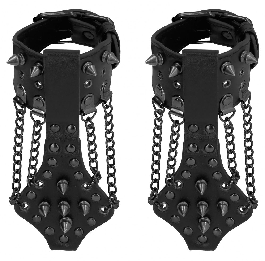 Агрессивные наручники из экокожи с металлической фурнитурой. Размер легко регулируется при помощи застежек. Имеются металлические D-крепления, которые позволяют комбинировать наручники с различными аксессуарами (поводком и ошейником). Длина кистевой накладки -10 см. Ширина - 4 см.