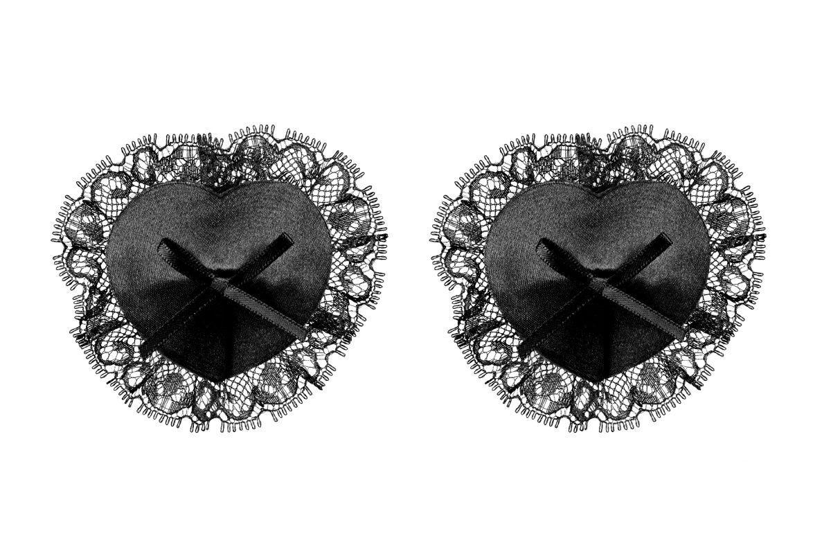 Черные пэстисы в форме сердечек. Украшены кружевной оборкой и атласными бантиками.