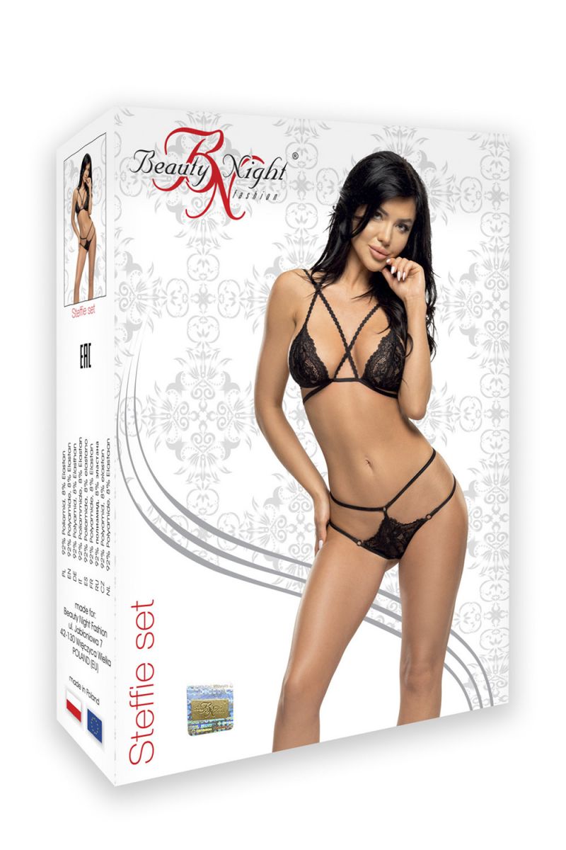 Черный кружевной комплект белья Steffie. Состоит из кружевного бюстгальтера со стрепами и трусиков-стринг. В комплекте: бюстгальтер, трусики-стринги.