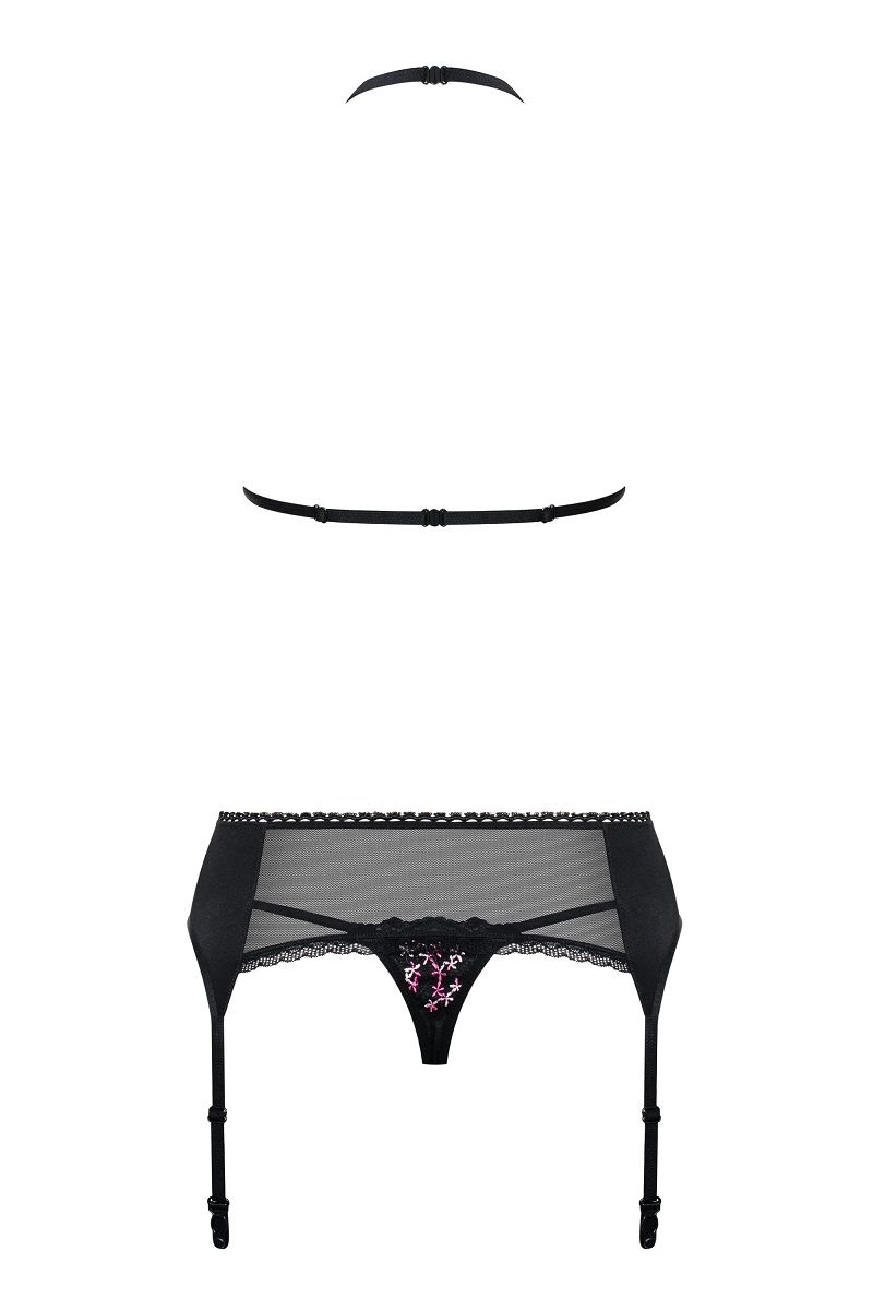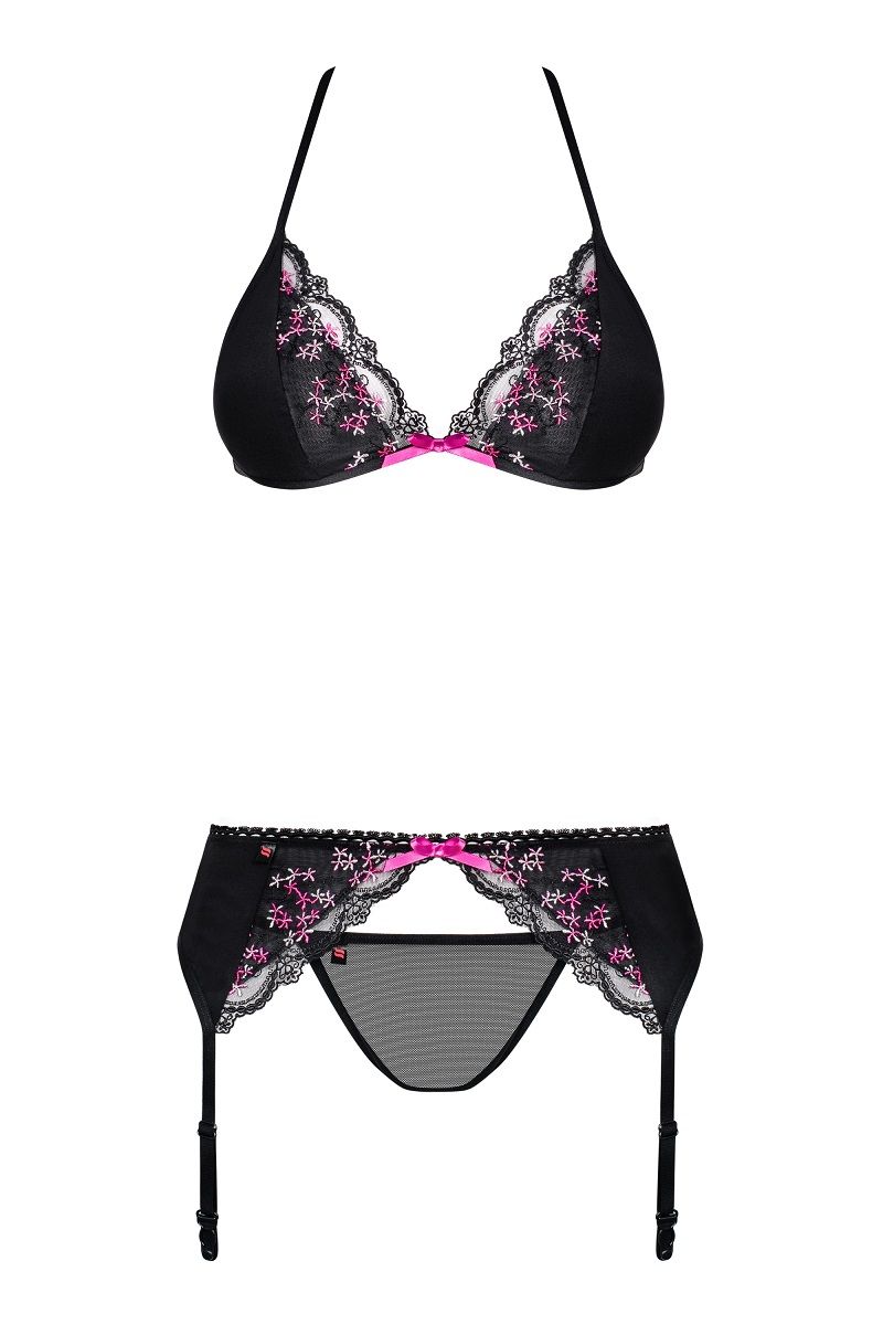 Эффектный комплект Floweria с мелкими цветочками на кружеве. В комплекте: лиф, трусики-стринги, пояс для чулок.