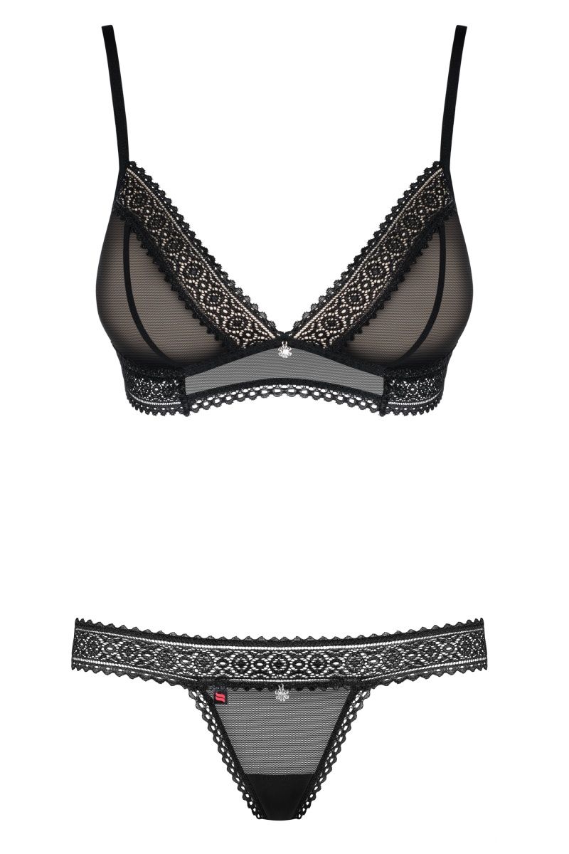 Комплект белья выполнен из полупрозрачной сетки и элегантного кружева. Лиф с мягкой чашкой, бретели и застежка на спинке регулируются. В комплекте: бюстгальтер и трусики-стринги.