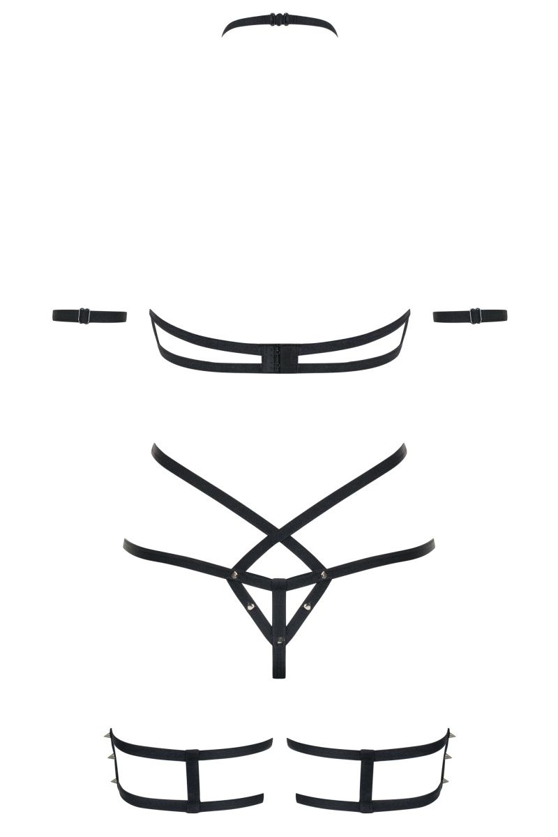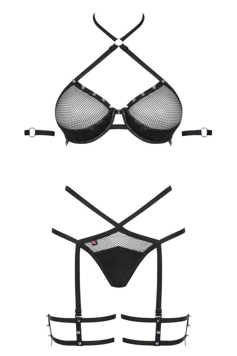 Полупрозрачный комплект: бюстгальтер, чашка мягкая на косточке. Трусики с подвязками. Украшение на руки. Комплект украшен металлическими кольцами и заклёпками. В комплекте: бюстгальтер, трусики-стринги с гартерами, украшения на руки.