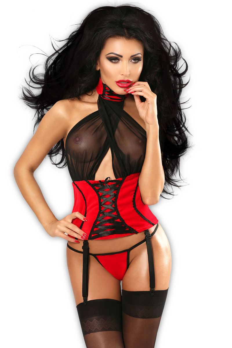 Полный изящности и эротики комплект. Он состоит из топа-корсета и трусиков. Верх из шифона подчеркивает и обнажает бюст, а тонкие драпировки оптически увеличивают его. Широкий пояс выполнен в сочном красном цвете из бархата. В центральной части талии атласная шнуровка, продета сквозь петли. В комплекте: топ-корсет, трусики-стринги.