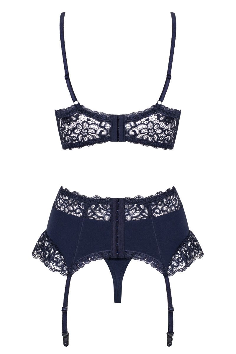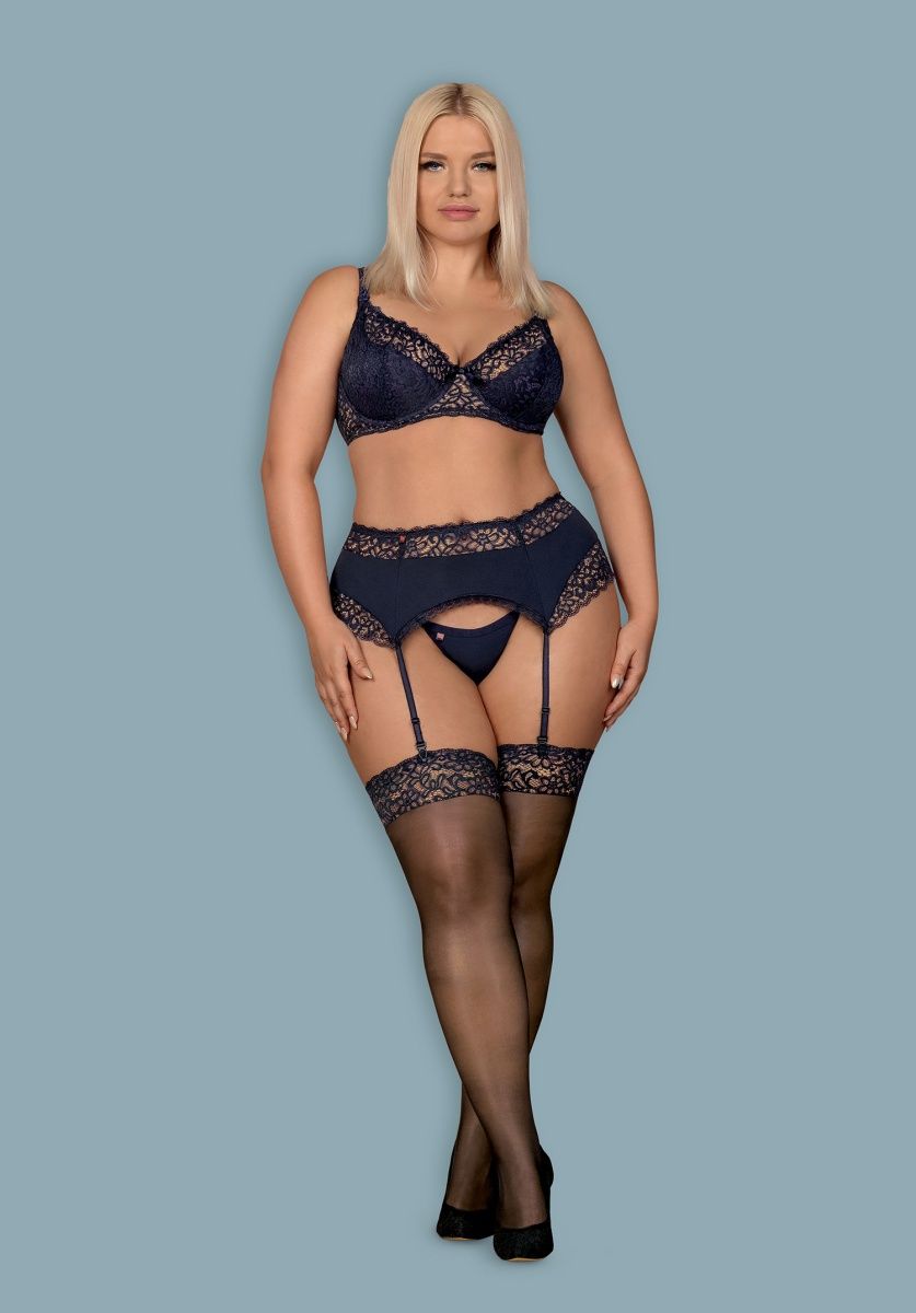 Стильный комплект женского белья. Бюстгальтер на косточках и поролоне с подкладкой прекрасно подходит для пышной груди. Спереди бра украшен атласным бантиком. Сзади застежка на три ряда крючков для наилучшего прилегания. Бретели регулируются по длине. Широкий пояс с высокой посадкой также расшит кружевом и оборками. Сзади застежка на крючки. Пажи регулируются по длине. В комплекте: бюстгальтер, трусики-стринги, пояс для чулок.