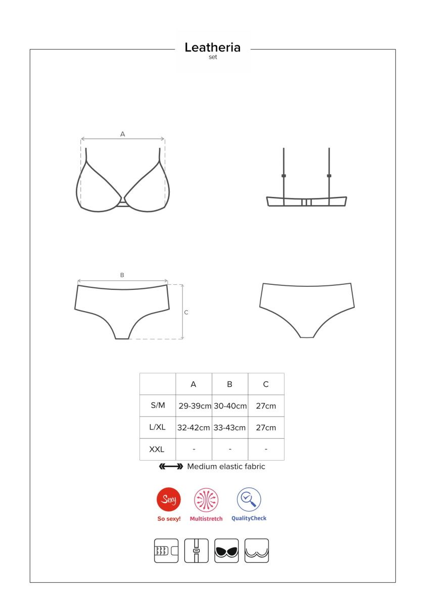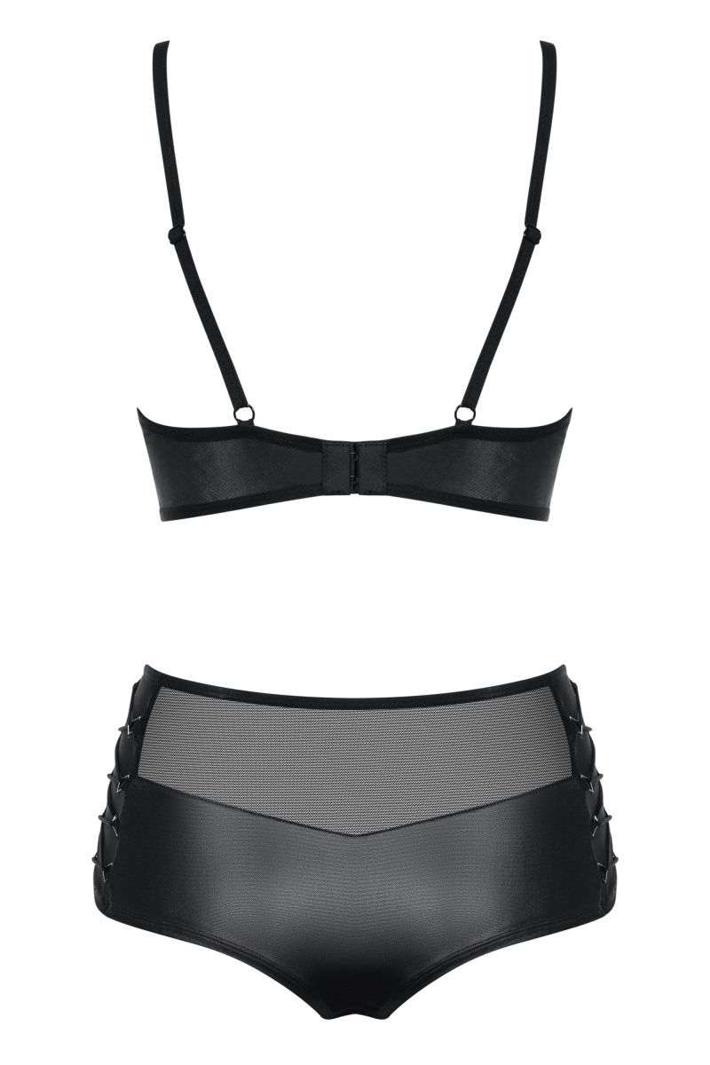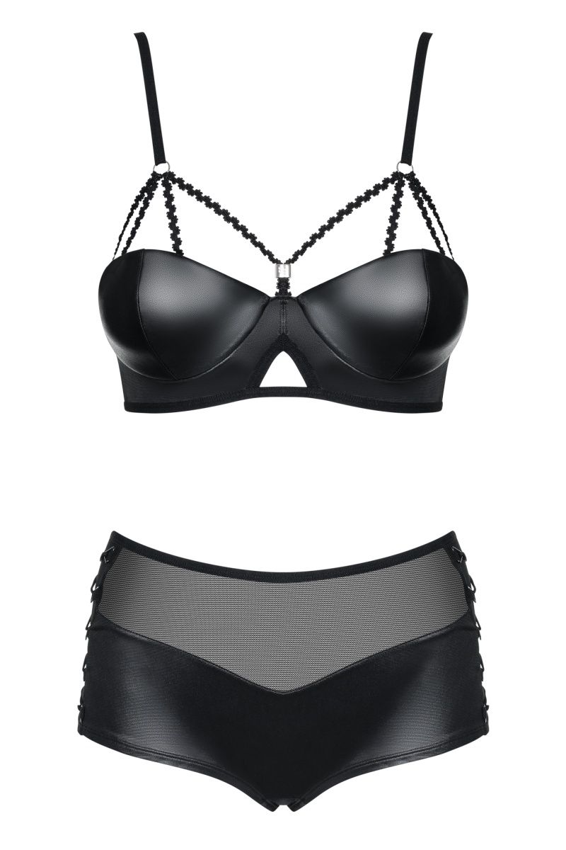 Эффектный комплект белья Leatheria состоит из бюстгальтера и трусиков, выполнен из эластичной эко-кожи. Лиф мягкий на косточках, бретельки и застежка на спинке регулируются. Трусики с высокой посадкой, выполнены из эластичной эко-кожи и мягкой сеточки, по бокам украшены соблазнительной шнуровкой В комплекте: бюстгальтер, трусики-шорты.