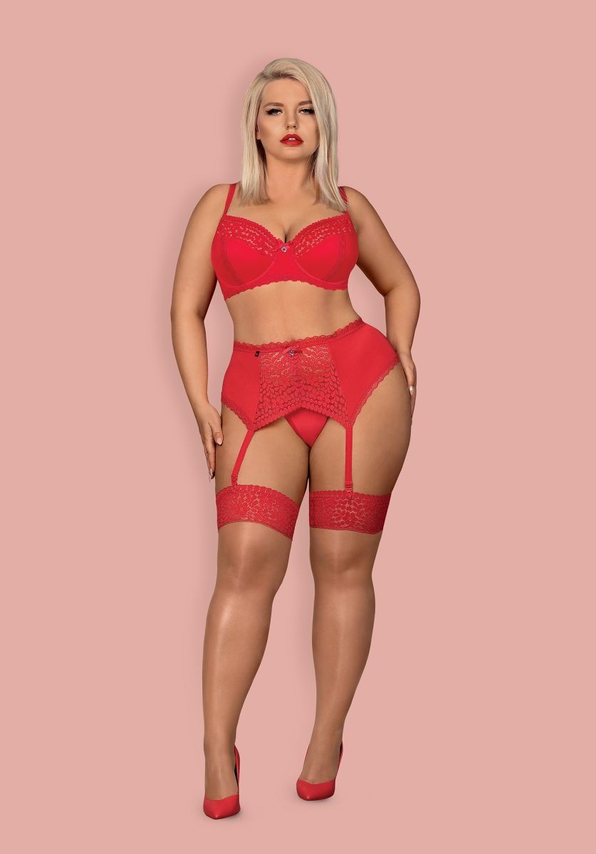 Страстный комплект белья из трех предметов. Бюстгальтер предназначен для полного бюста. Косточки и поролоновая вставка в нижней части великолепно моделируют грудь. Мягкое кружево в верхней части бюста декорировано узором. Между чашечек украшение в форме сердечка со стразом и атласный бантик. Три ряда застежек крючков сзади обеспечивают дополнительный комфорт и прекрасное прилегание. Бретели регулируются по длине. Широкий пояс выполнен из гладкой эластичной ткани и узорчатого кружева. Сзади дополнен игривой атласной шнуровкой. Спереди также украшен подвеской и бантиком. Четыре пажа регулируются по длине. В комплекте: бюстгальтер, трусики-стринги, пояс для чулок.