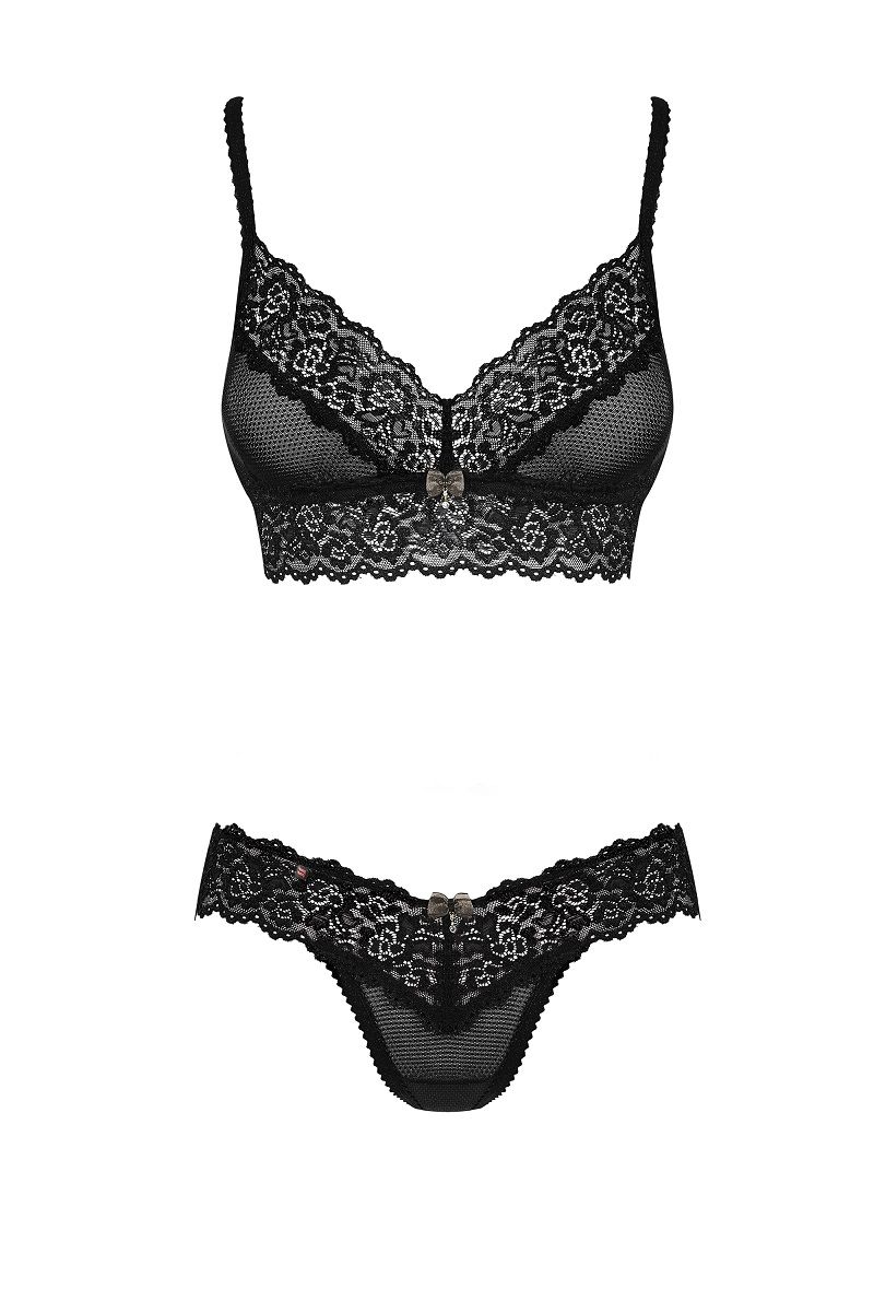 Комплект белья (бюстгальтер и трусы) выполнен из эластичной сеточки в сочетании с кружевом. В комплекте: бюстгальтер, трусики-стринги.