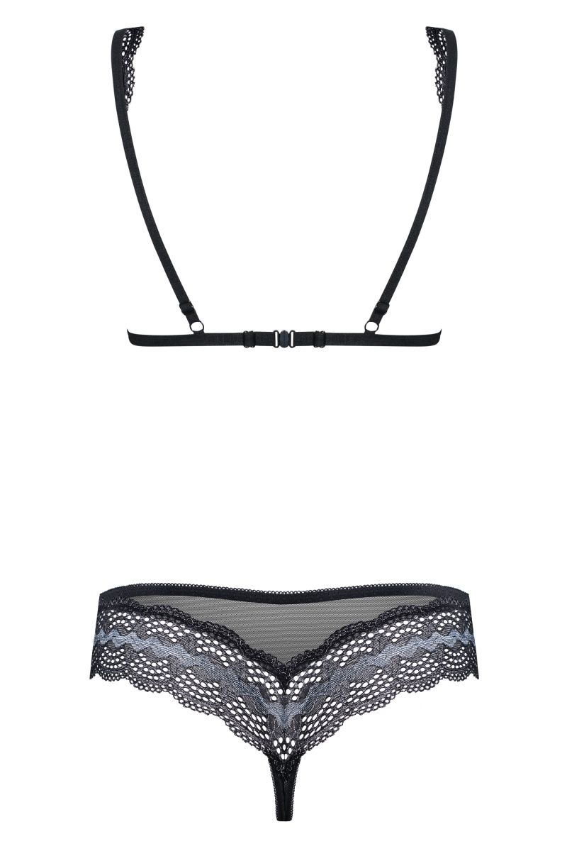 Комплект белья выполнен из полупрозрачной сетки и элегантного кружева. Лиф с регулируемыми бретелями, на спинке застежка. В комплекте: бюстгальтер и трусики.