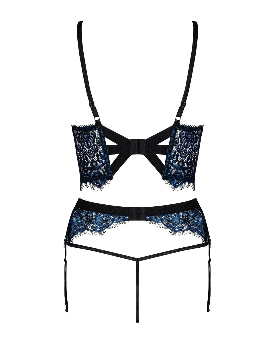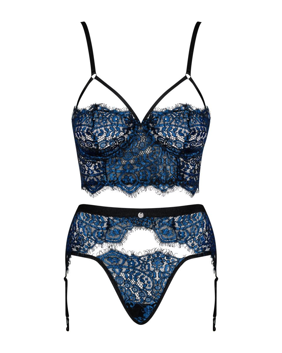 Комплект белья из серии Yassmyne из кружева. Бюстгальтер на косточках, тонкие бретельки регулируются по длине, на спине застежка-удлинитель. Широкое кружево под бюстом визуально вытягивает силуэт. Пояс с застежкой-удлинителем на спине, пажи для чулок регулируются по длине. Кружевные трусики-стринги. В комплекте: бюстгальтер, трусики-стринги, пояс для чулок.