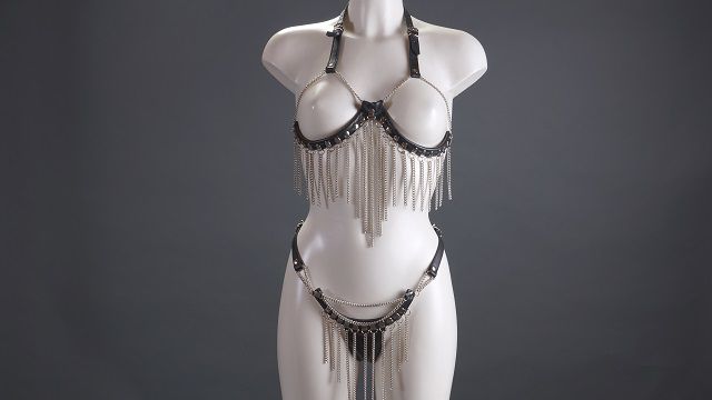 Одежда в стиле БДСМ способна создать особое настроение и разнообразить сексуальную жизнь. Представленный комплект состоит из откровенного лифа и стрингов. Белье изготовлено из натуральной кожи и декорировано металлическими цепочками. Лиф имитирует поддерживает и выгодно подчеркивает грудь. Все детали белья тщательно продуманы и выполнены вручную. Ремешки позволяют регулировать размер комплекта. В комплекте: лиф, трусики-стринг.