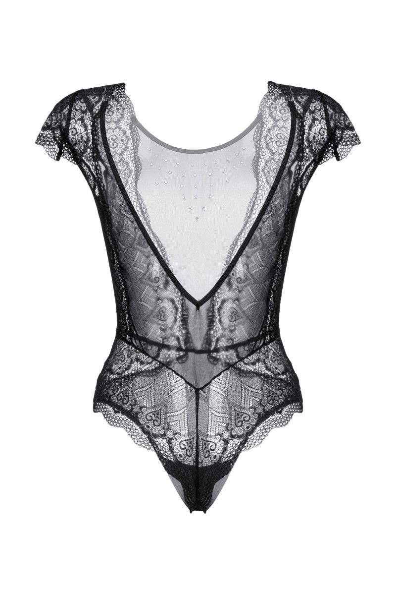 Боди приталенного силуэта из эластичной сетки с шикарными кружевными вставками, открытой спиной, миниатюрными рукавами. Декольте украшено россыпью страз.