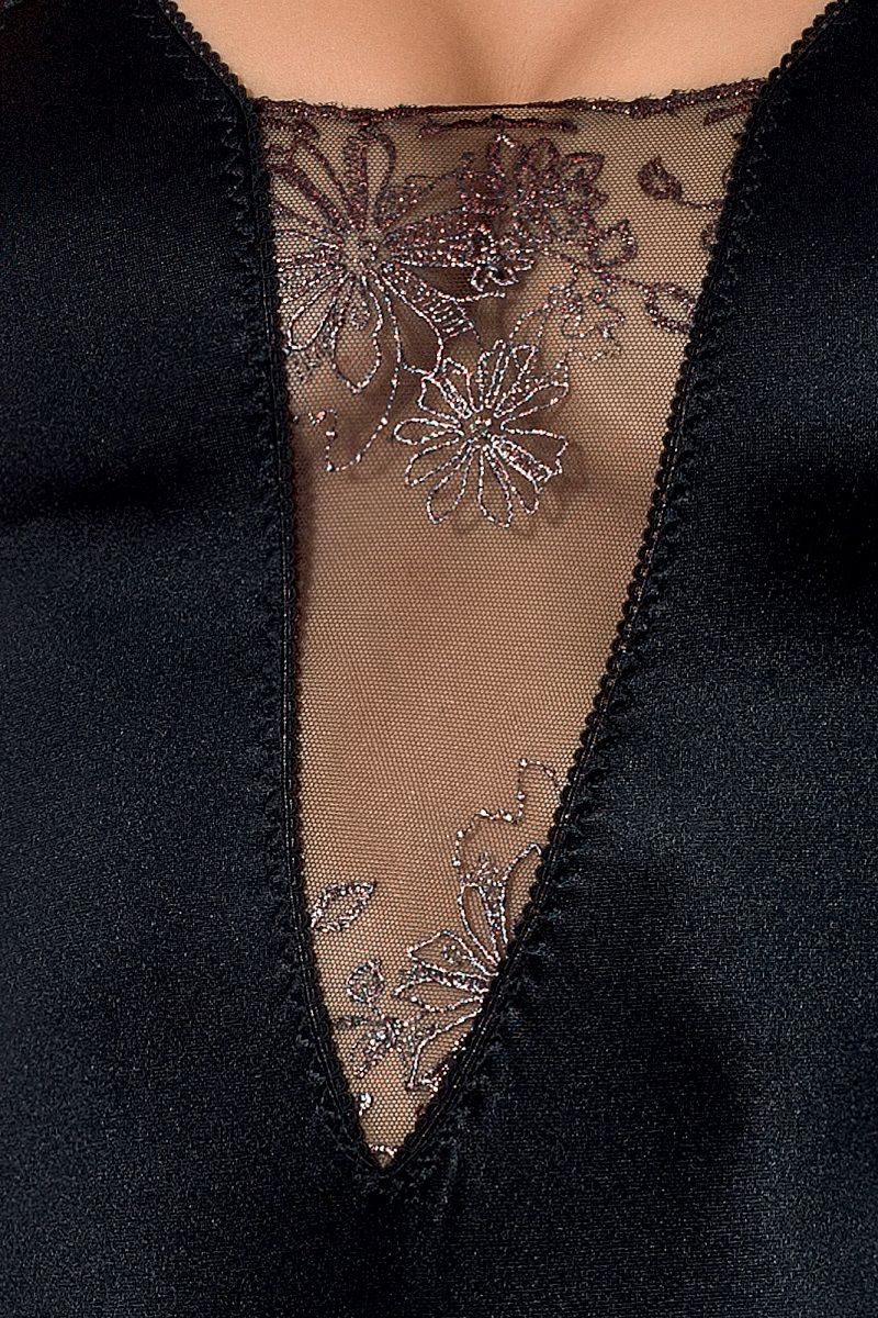 Боди из стрейч-атласного материала на тонких бретелях, зона декольте и низ изделия украшен полупрозрачной вставкой с вышивкой, низ боди на застежке на крючках. Бретели крест на крест, регулируются по длине.