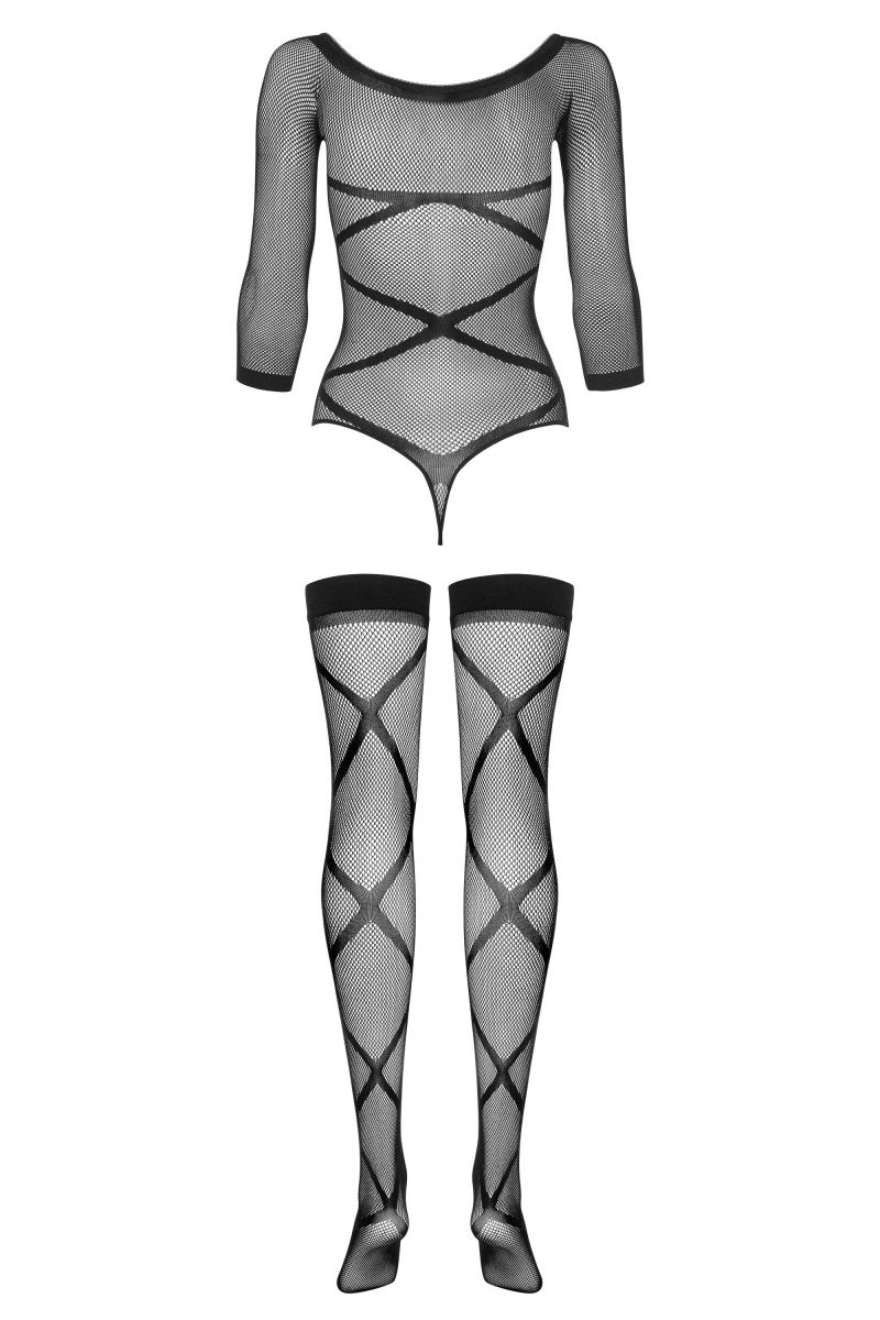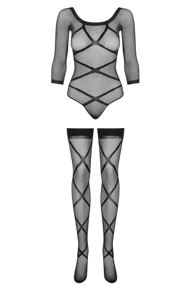 Полупрозрачное боди-сетка выполнена из эластичного и приятного на ощупь материала с оригинальным рисунком. Чулки с такими же полосками крест-накрест в комплекте. В комплекте: боди, чулки.
