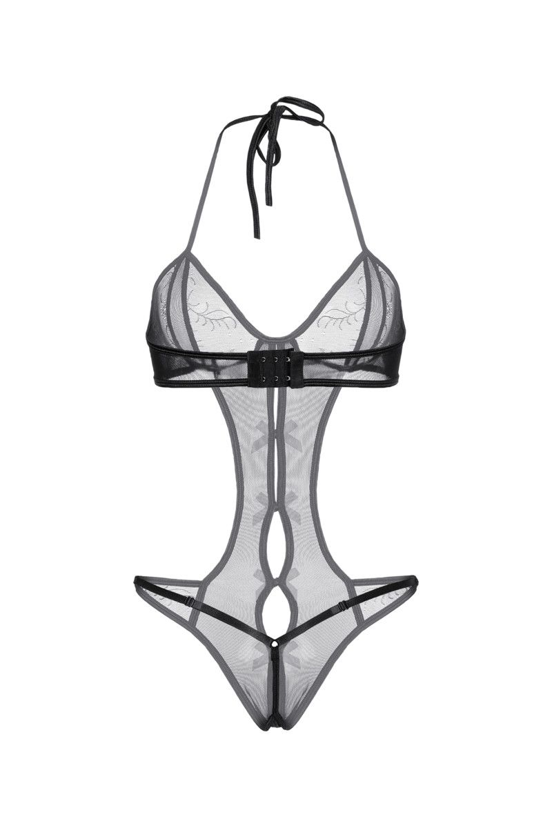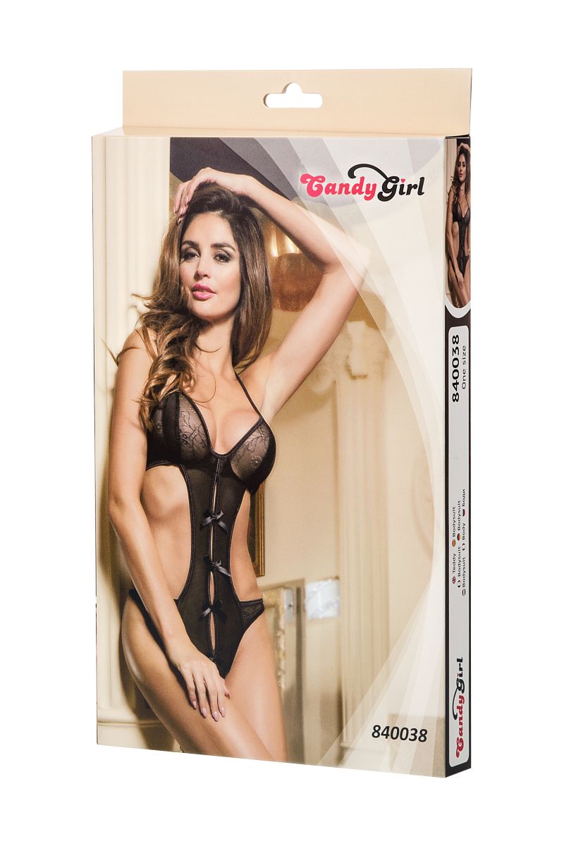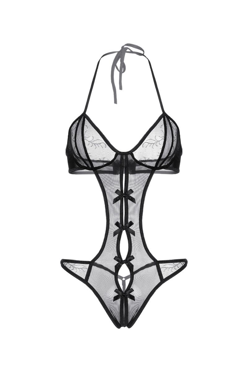 Мягкое боди-монокини из эластичной сетки. Продольный фигурный вырез дополнен сатиновыми бантиками. Завязки на шее, тройная застежка крюк-петля сзади. Регулируемые боковые перемычки.