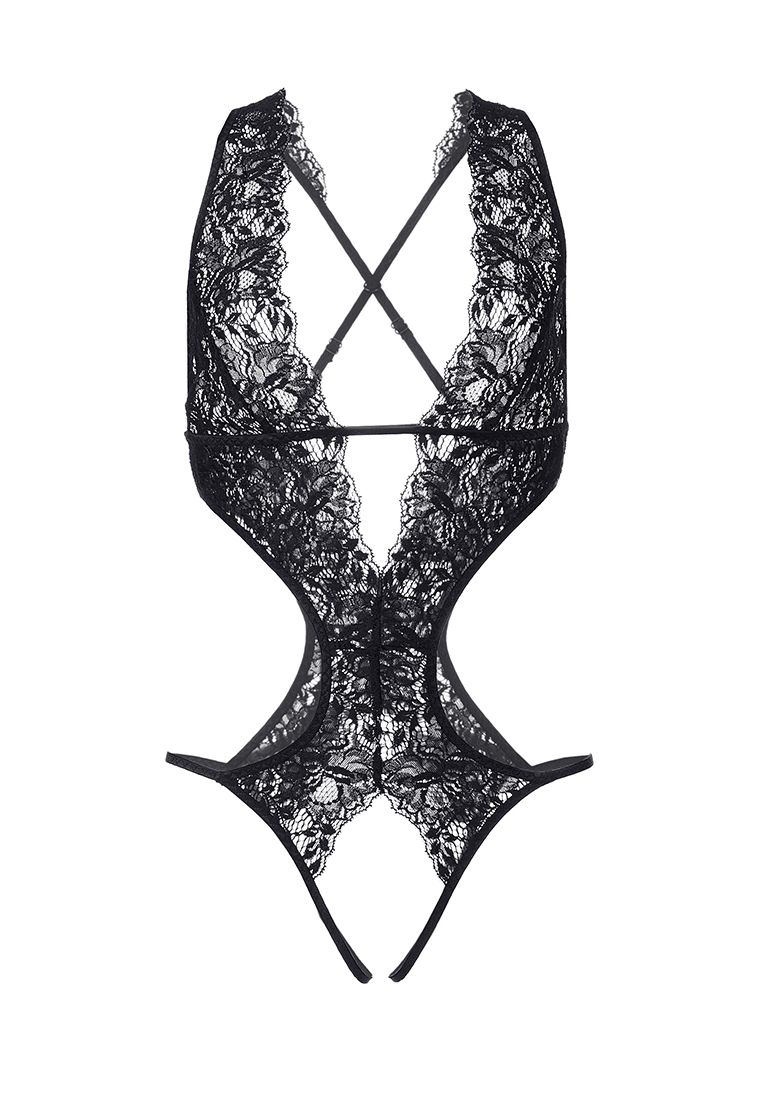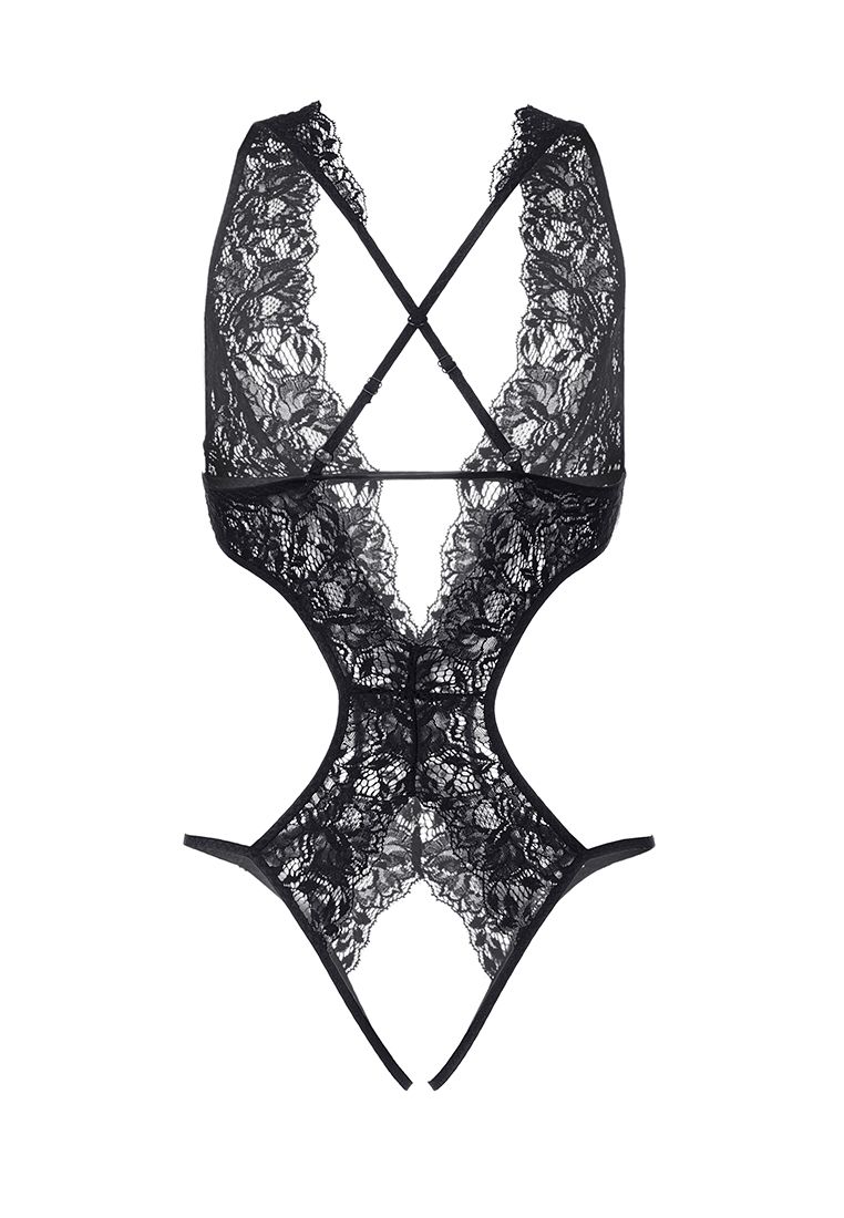 Эротическое боди кружевное, эластичное. Глубокое декольте, спина и интимный вырез оформлены свободным кружевным краем. Перекрещивающиеся регулируемые бретели. Допускается замена кружева на аналогичное.