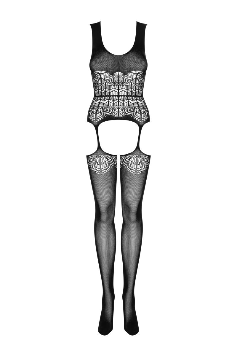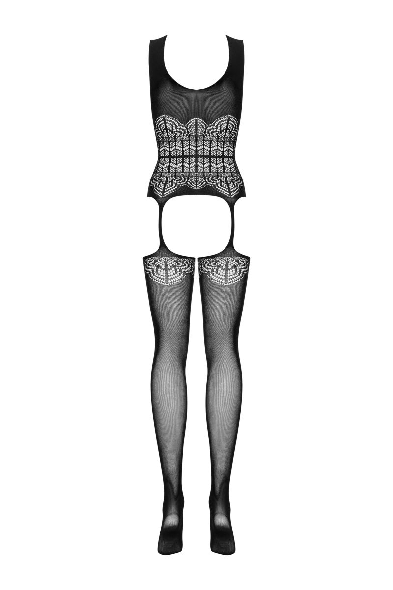 Кокетливый боди-комбинезон из ткани плотного плетения с имитацией топа и чулок. Модель на широких бретелях на талии украшена геометрическим узором. Чулки соединяются с топом бесшовным плетением. Узор повторяется в верхней части чулок