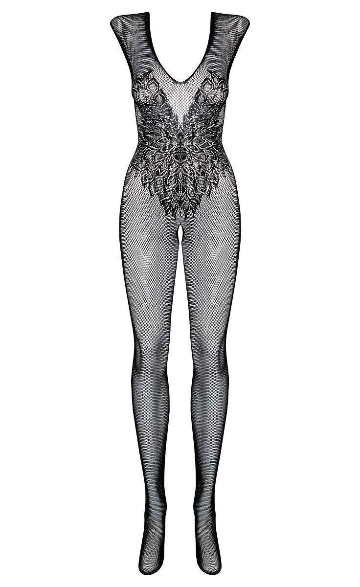 Боди-комбинезон в мелкую сеточку, спину украшает рисунок в форме крыльев, спереди цветочный орнамент.