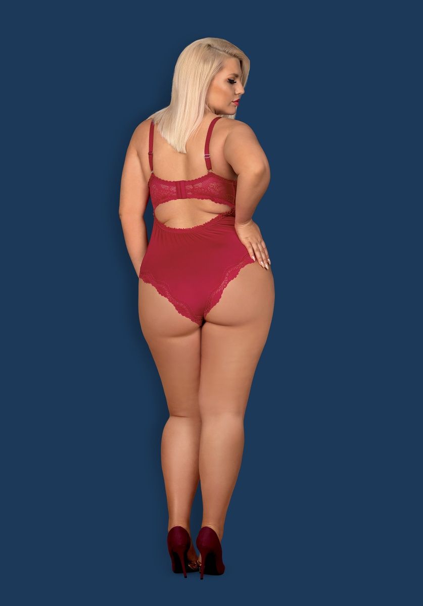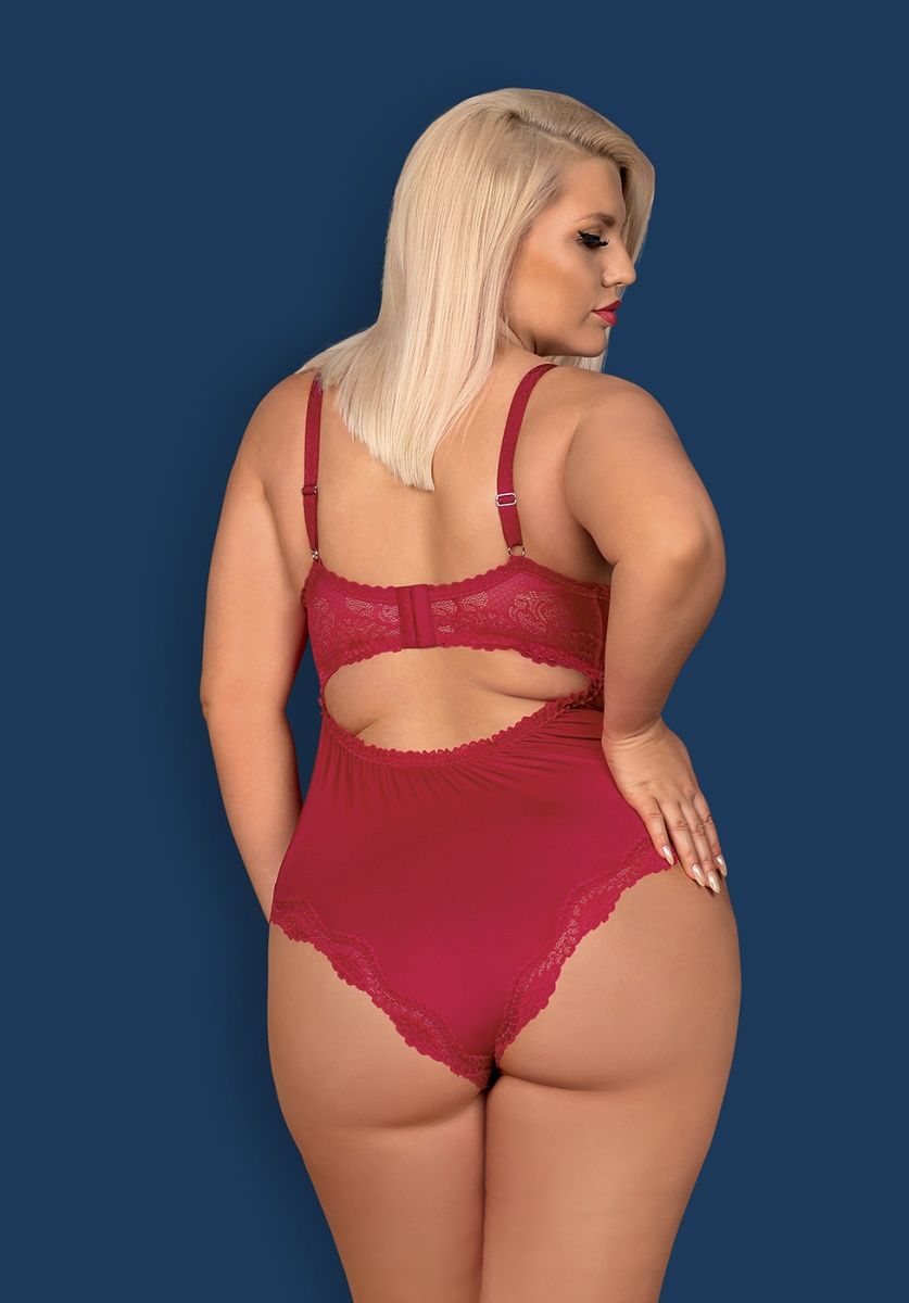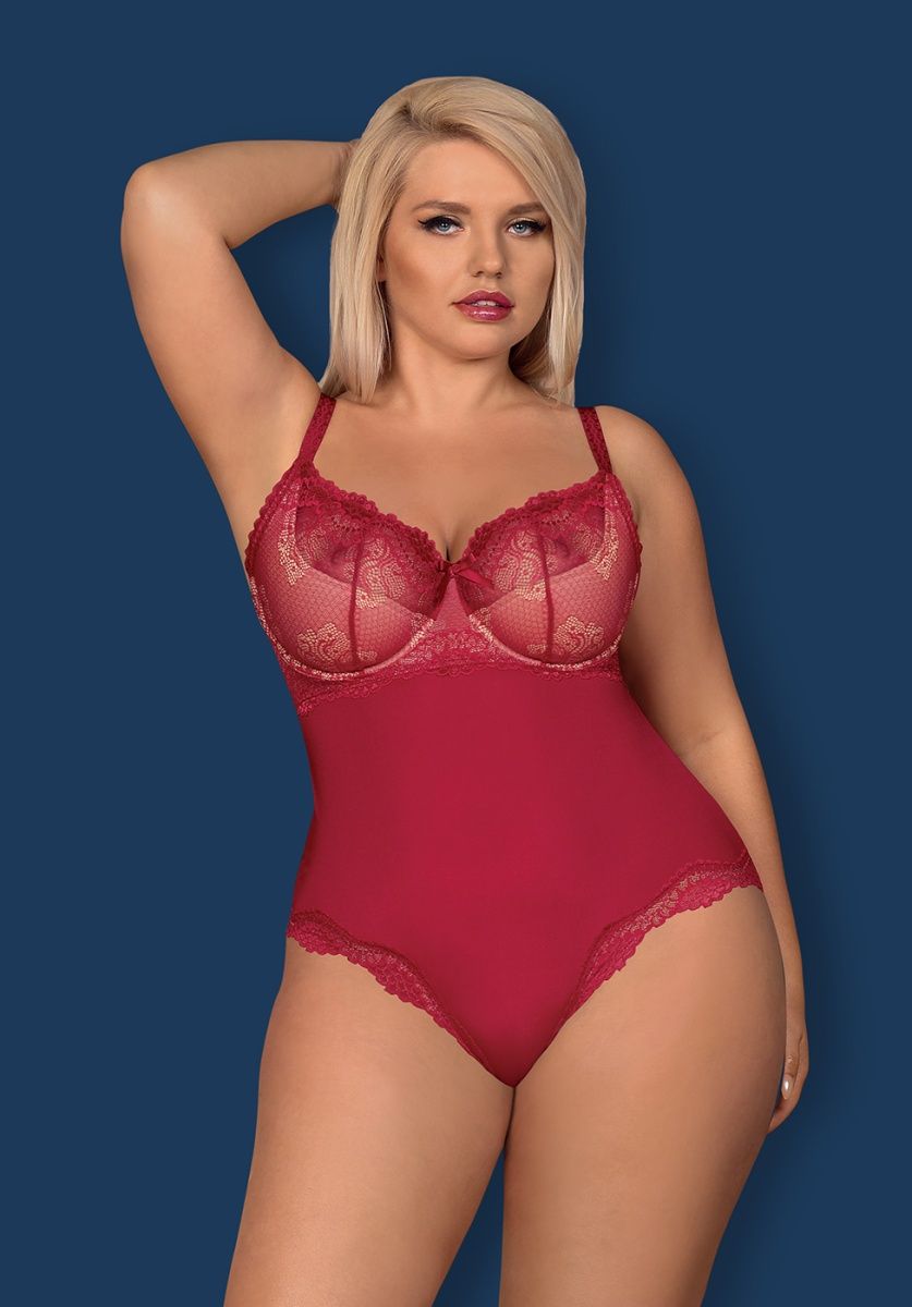 Женское боди из гладкой эластичной ткани. Модель предназначена для обладательниц пышного бюста. Чашечки на косточках с поролоном в нижней части поддерживают и приподнимают грудь. Узорчатое кружево сверху украшает боди. Между чашечками красуется атласный бантик. Кокетливый вырез на спинке расшит кружевной оборкой. Низ изделия украшен кружевной оборкой. Бретели регулируются по длине.