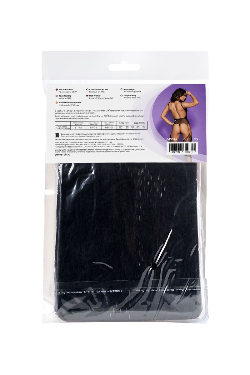 У костюма из боди с открытой спиной и чулок Tatiyannah весьма неординарный дизайн сочетания сеток разной плотности.