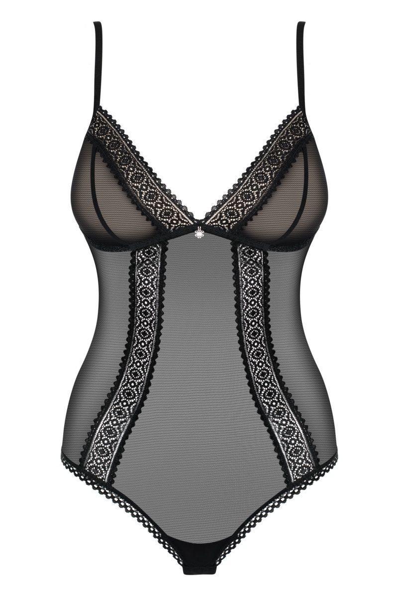 Полупрозрачное боди с мягкой чашкой, бретели регулируются по длине. Боди украшают кружевные вставки и атласный бантик на спинке.