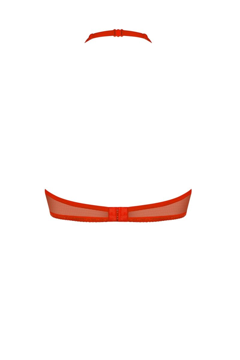 Бюстгальтер без косточек крепится за шеей. Лиф декорирован стреп-лентами.
