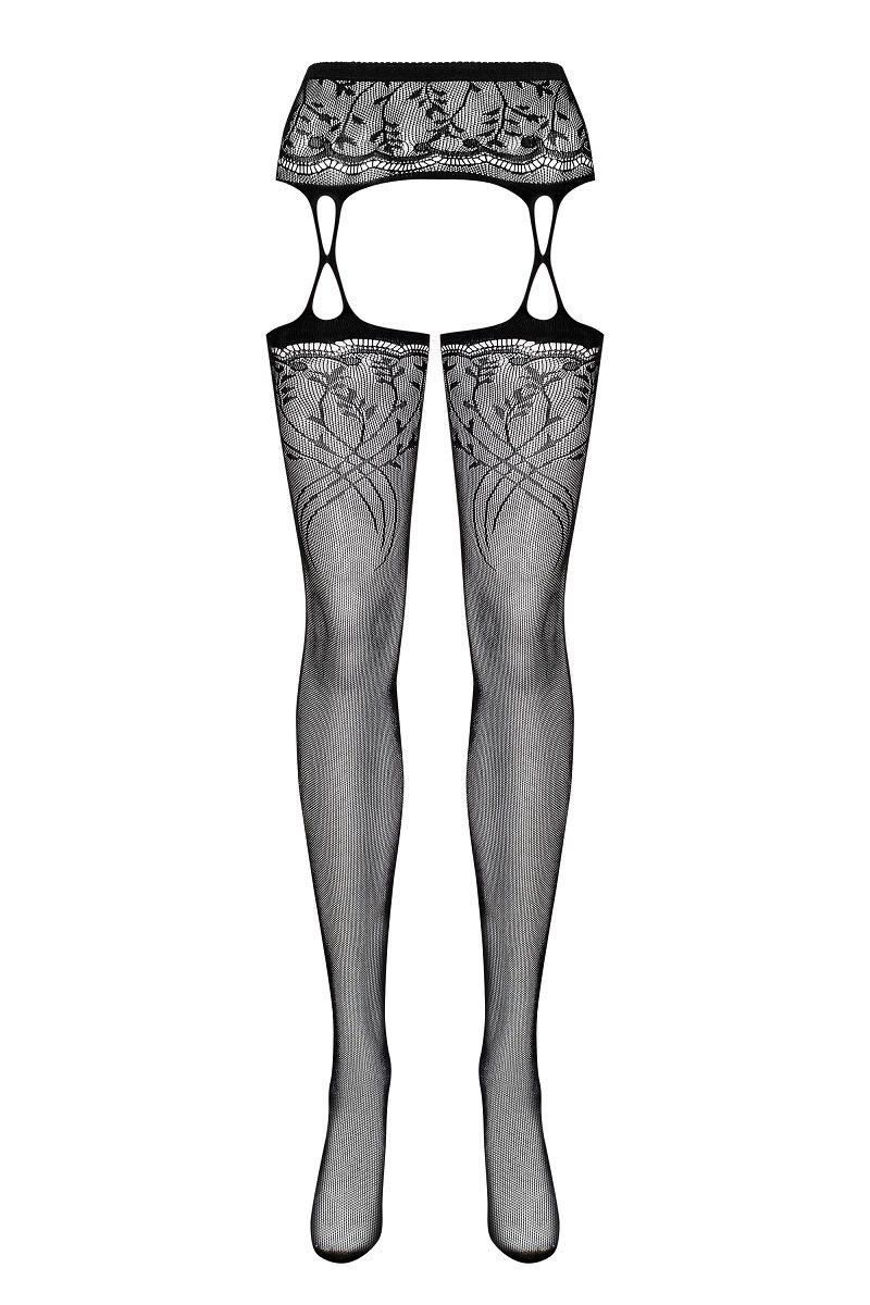 Чулки с подвязками и поясом три в одном комплекте! Нежный цветочный рисунок на поясе и по верху чулок, открытая промежность.