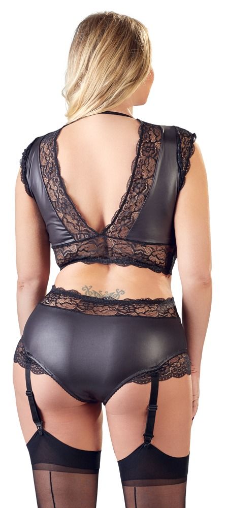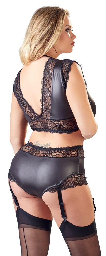 Чувственный wet-look комплект с кружевной отделкой. Состоит из топа и трусиков-слип с пажами для чулок. Красиво облегает, подчеркивая достоинства фигуры. В комплекте: топ, трусики с пажами.