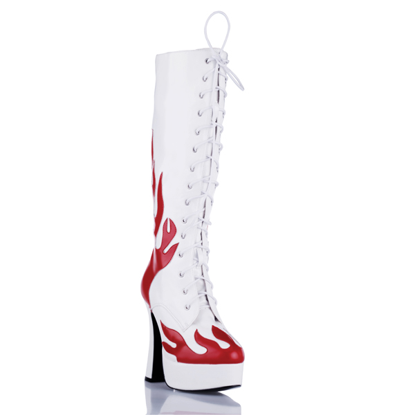 Белые сапоги до колена из лаковой искусственной кожи на высоком устойчивом каблуке. Носок и пятка декорированы красными языками пламени. По всей длине утепленного сапога сзади молния, спереди шнуровка, которая поможет подтянуть сапог по ноге. Высота платформы - 4 см, высота каблука - 12,5 см.