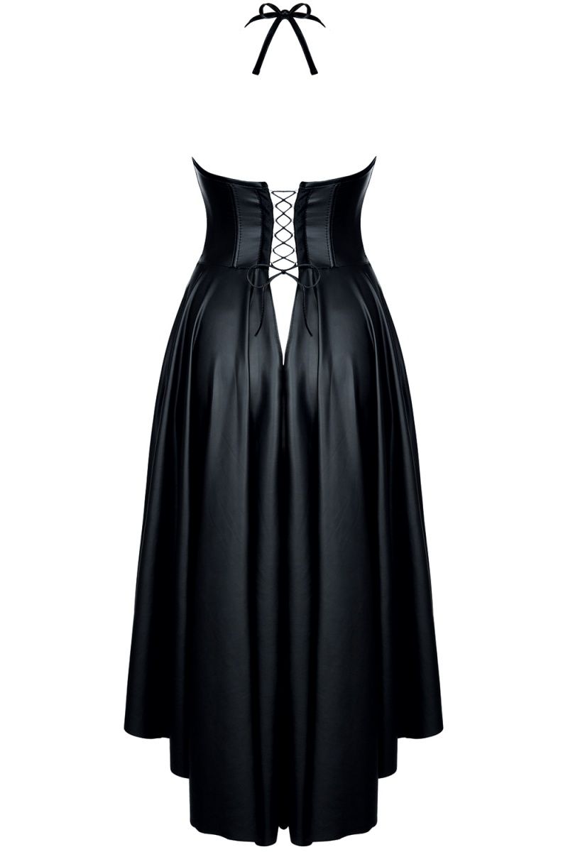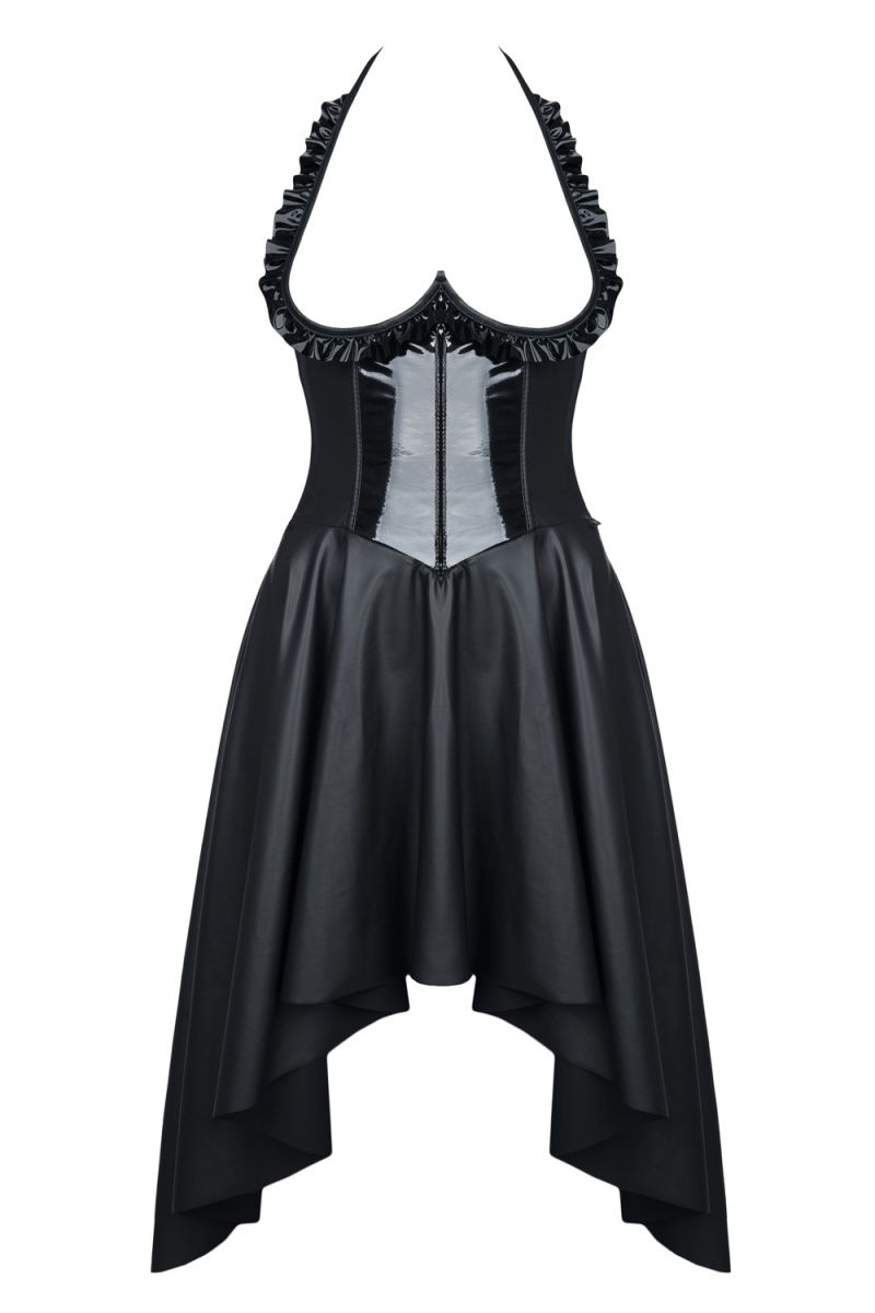 Платье Christine – впечатлит вашего партнера и не даст ему отвести взгляд. Оно полностью изготовлено из черного матового материала с изящными вставками из черной ткани с эффектом «мокрой» кожи. Но самое важное – это конечно возможность насладиться аппетитными формами груди, взгляд к которым будет прикован благодаря утонченной окантовке из глянцевого материала. Нижняя часть платья выполнена специфично. Длинное сзади, но укороченное спереди оно так и манит насладиться видом изящных ножек.