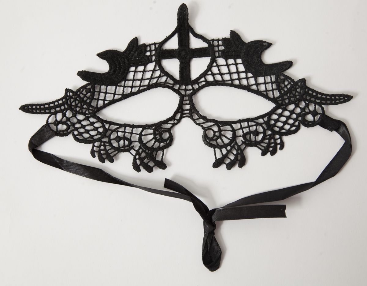 Кружевная маска в венецианском стиле с многочисленными узорами и перевернутым крестиком по центру. Завязывается на атласные ленты. Упаковка - бумажный конверт. Размеры - 25 х 13 см.