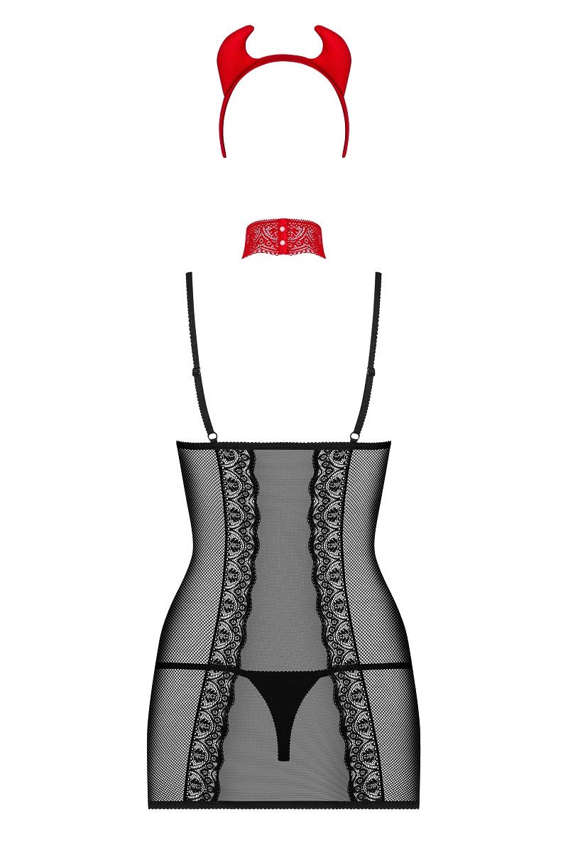 Эротический костюм дьяволицы. В комплекте: платье, трусики-стринги, ошейник, рожки, мини-плеть.