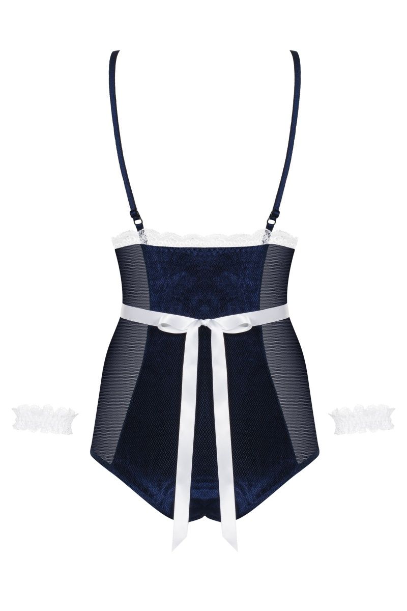 Эротическое боди Maid выполнено из нежного бархата и полупрозрачных вставок по бокам. Лиф на тонком поролоне без косточек, бретельки регулируются по длине. В комплекте: боди, фартук, чепец и аксессуары на запястья.