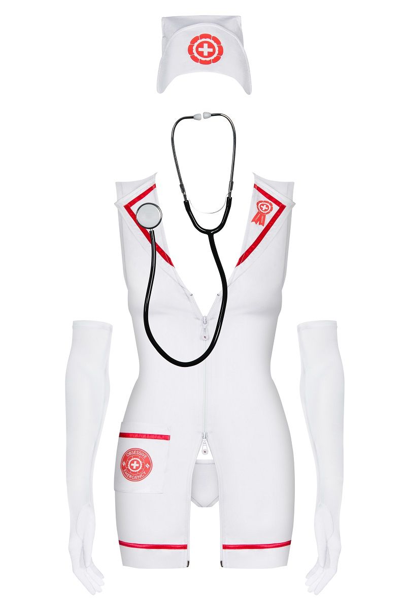 Костюм сексуальной медсестры из 5 частей выполнен из мягкой эластичной ткани белого цвета, отлично облегающей тело и невероятно приятной на ощупь. Короткое платье застегивается спереди с помощью застежки- молнии – просто одеть, приятно носить и легко снять! Без рукавов. Декоративный кармашек украшен эмблемой скорой помощи. Образ продуман до мелочей, и как его завершение - стетоскоп. Дышите глубже! В комплекте: платье медсестры, шапочка, трусики-стринги, стетоскоп, перчатки.
