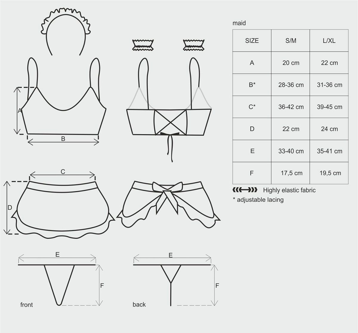 Соблазнительный костюм горничной. В комплект входит топ на шнуровке, фартучек, манжеты, трусики стринги и головной убор. В комплекте: топ, фартук, манжеты, трусики-стринги, головной убор.
