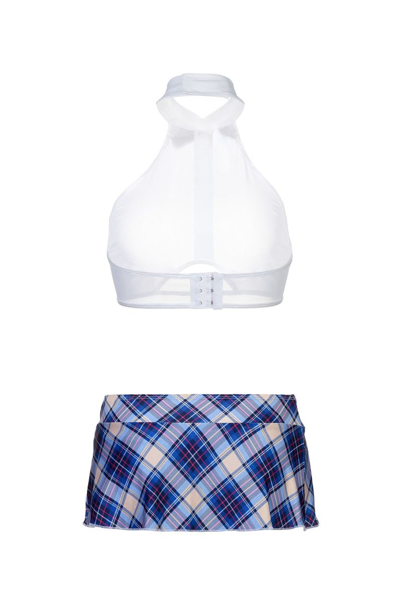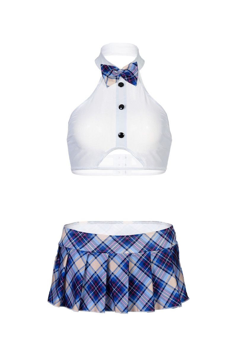 Костюм школьницы. Топ из эластичной сетки декорирован спереди непрозрачной вставкой и пуговицами, на застежке крюк-петля сзади. Воротник-стойка на липучке , украшен контрастным бантом. Юбка, Т-стринги и бант выполнены из клетчатого трикотажа. В комплекте: топ, юбка и стринги.