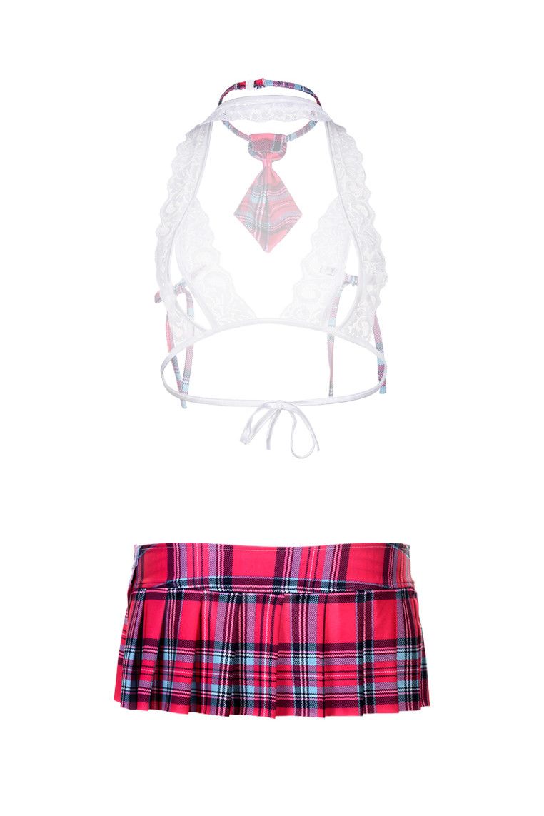 Сексуально раскрепощённая, готовая к урокам любви ученица – мечта миллионов мужчин. С этим костюмом школьницы и вы сможете стать девушкой из грёз! Глядя на ваш бюст, соски которого едва прикрыты завязками-бантиками, и упругую попку под подолом клетчатой юбочки, любимый обязательно захочет преподать вам с десяток уроков - нежности, страсти и чувственности! Открытый бюстгальтер с шаловливыми бантиками, юбочка и галстук.Доступен в едином размере S-M-L