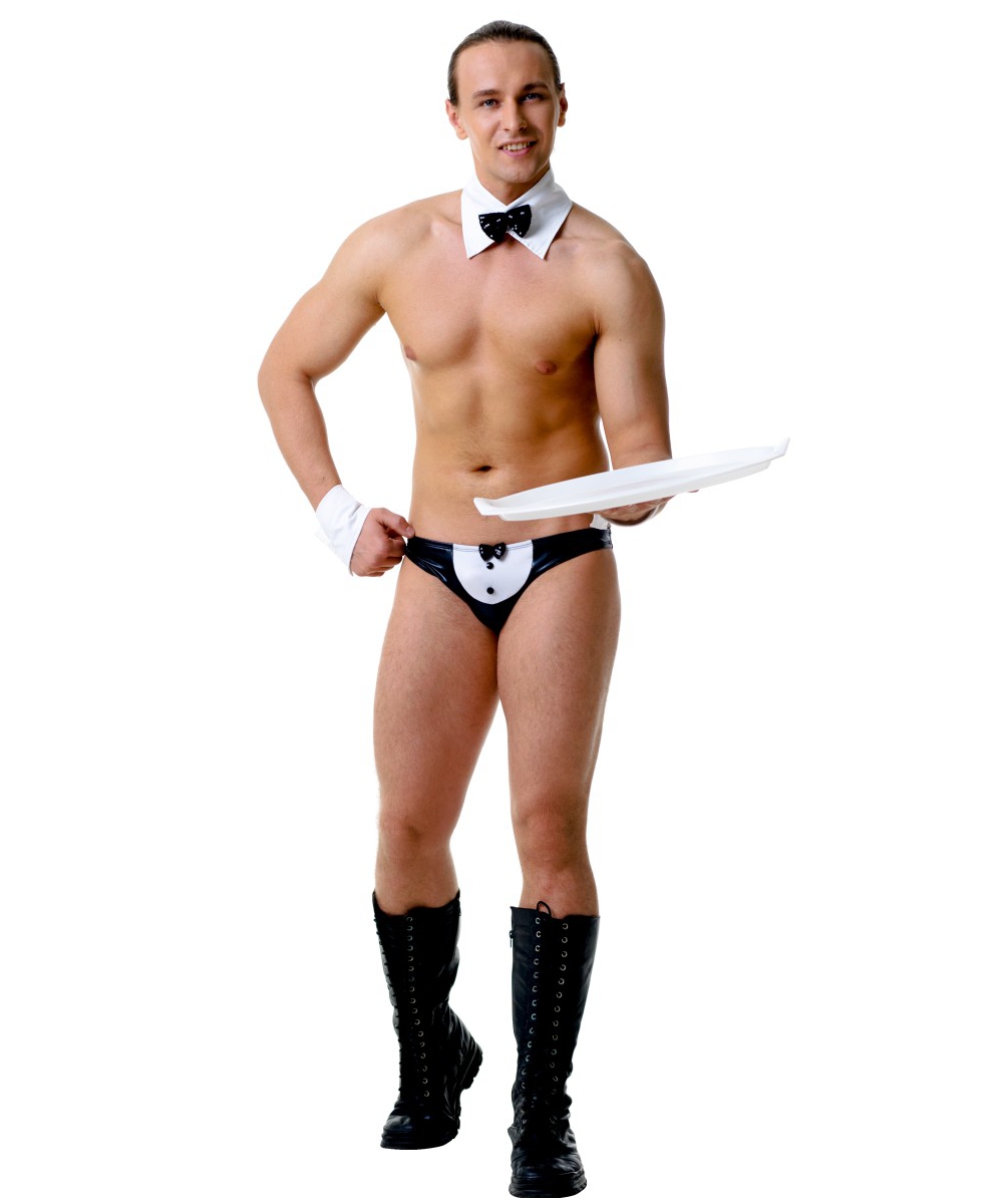 Когда этот обаятельный официант произнесёт своё «Чего изволите?», не стесняйтесь, просите всё, что душа пожелает. Откровенная униформа, состоящая из трусиков, манжет и воротничка, ясно говорит о том, что этот мужчина готов на всё ради больших чаевых! Костюм состоит из: накладного воротника, манжет, трусов.