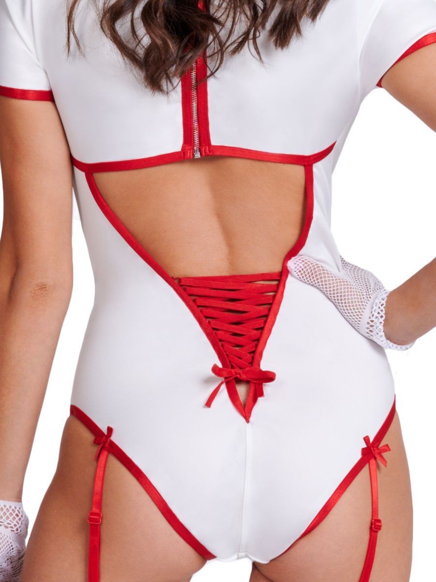 Абсолютно с любым недугом справится твоя личная медсестра. У нее для всех болезней свой особый способ лечения. Главное - не забыть подтянуть чулки перед началом целебных процедур! В комплекте: боди, чулки, перчатки, головной убор.