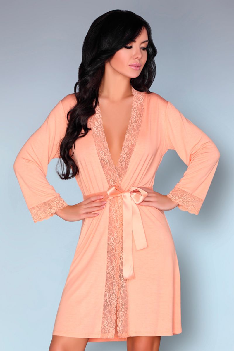 Пеньюар из вискозы нежного пастельного цвета, отделка кружево с цветочным рисунком. Пояс из атласной ленты.