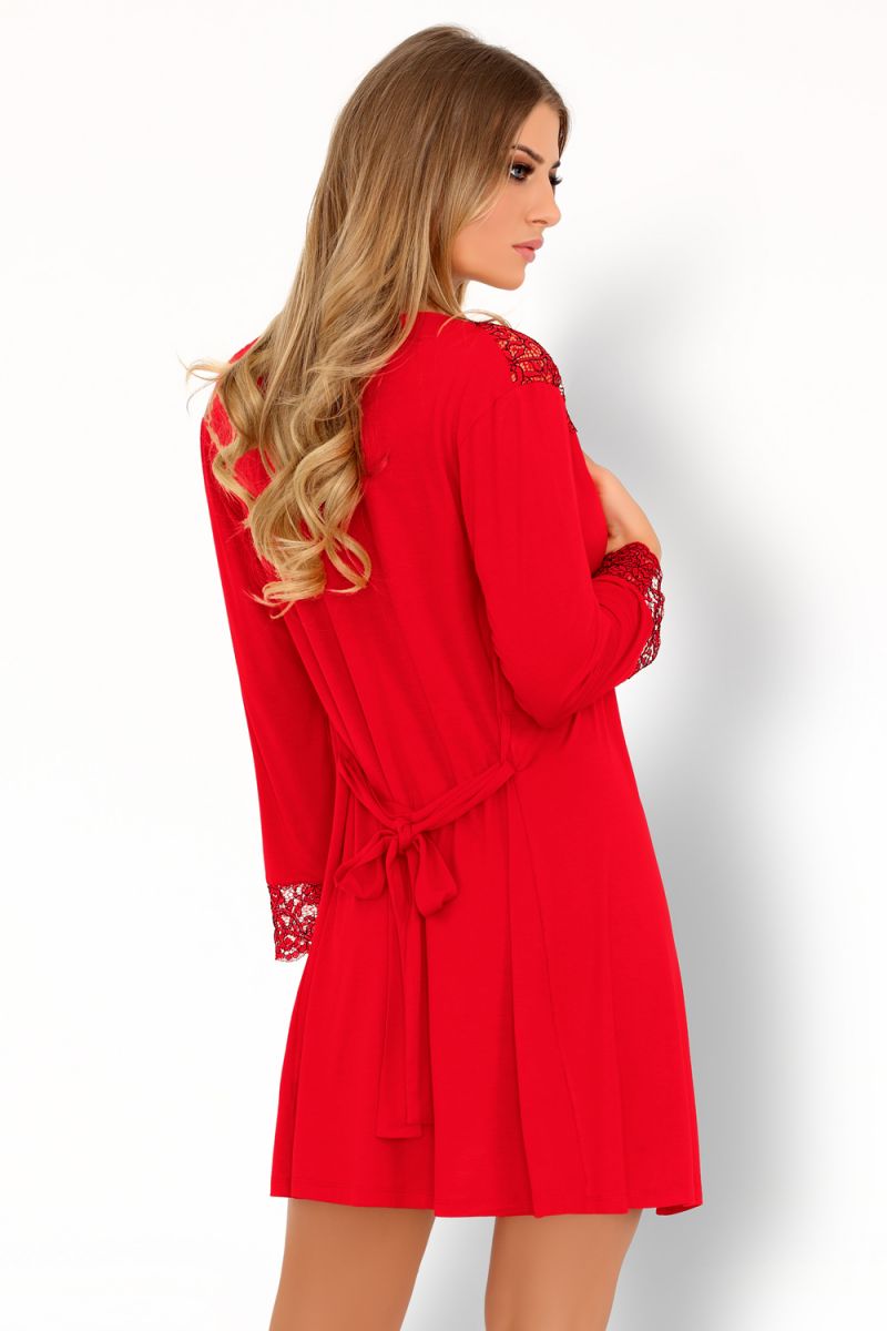 Короткий пеньюар подчеркивает длину ног и выделяет женскую фигуру. Глубокое декольте акцентирует внимание на груди. Халатик выполнен из приятной к телу вискозы с небольшим содержанием эластана. Рукава и плечи декорированы кружевом в тон. Пеньюар завязывается на запах на талии с помощью пояса. В комплекте: пеньюар и трусики-стринги.