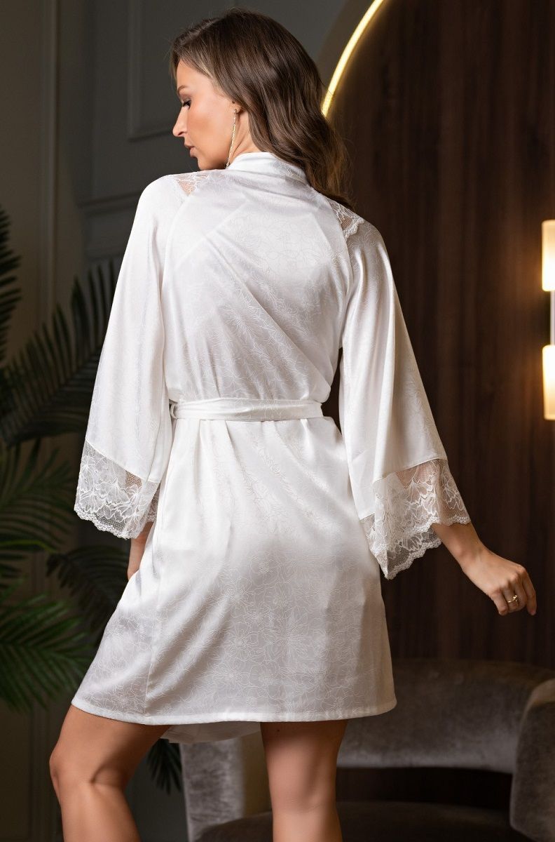 Элегантный короткий запашной халат с длинными широкими рукавами, выполнен из однотонного искусственного шелка на жаккардовой основе и дополнен кружевными вставками, которые расположены по верху и низу рукавов. По бокам обработаны карманы.