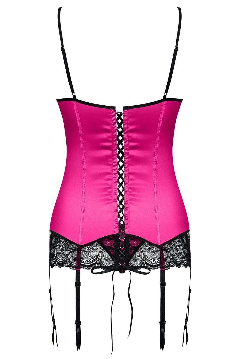 Обольстительный корсет для милых соблазнительниц из атласа цвета фуксии. Чашки и основание корсета украшены широким черным кружевом. Чашки бюстгальтера на косточках, бретели лифа регулируются по высоте. Корсет с пажами для чулок.