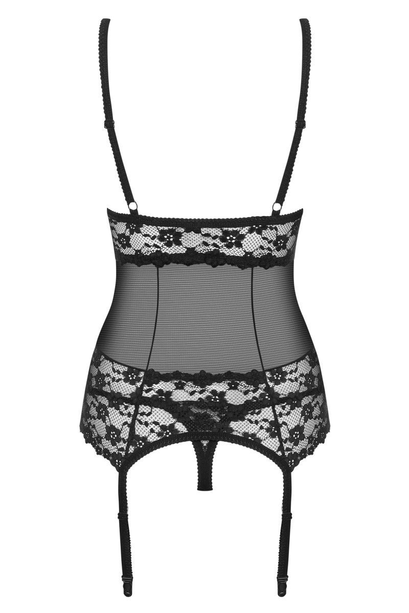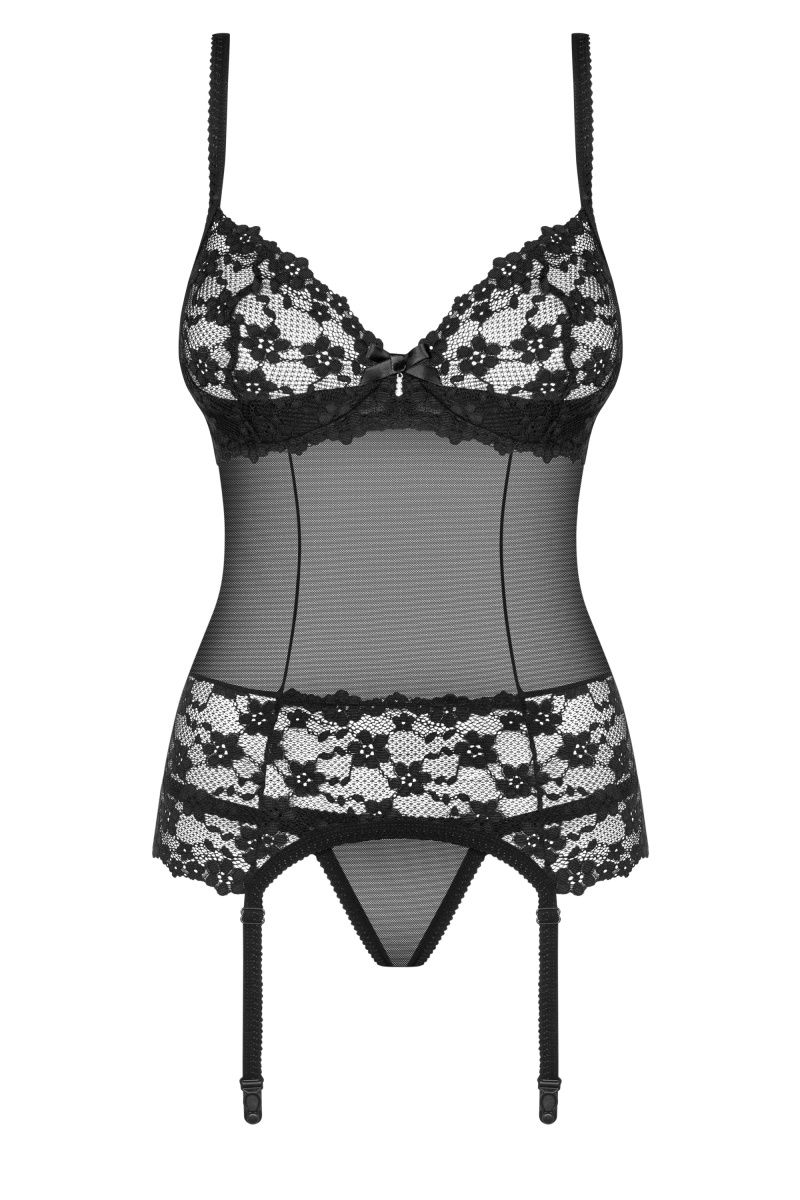 Элегантный корсаж, изготовленный из прозрачной вуали и узорчатого кружева. Чашечки корсажа на косточках с тонким поролоном снизу визуально делают грудь пышнее. Декоративный бантик и сверкающая подвеска привлекают внимание к зоне декольте. Бретели регулируются по длине. Низ корсажа также выполнен из кружева. Пажи позволяют дополнить корсаж чулочками. В комплекте: корсаж и трусики-стринги.