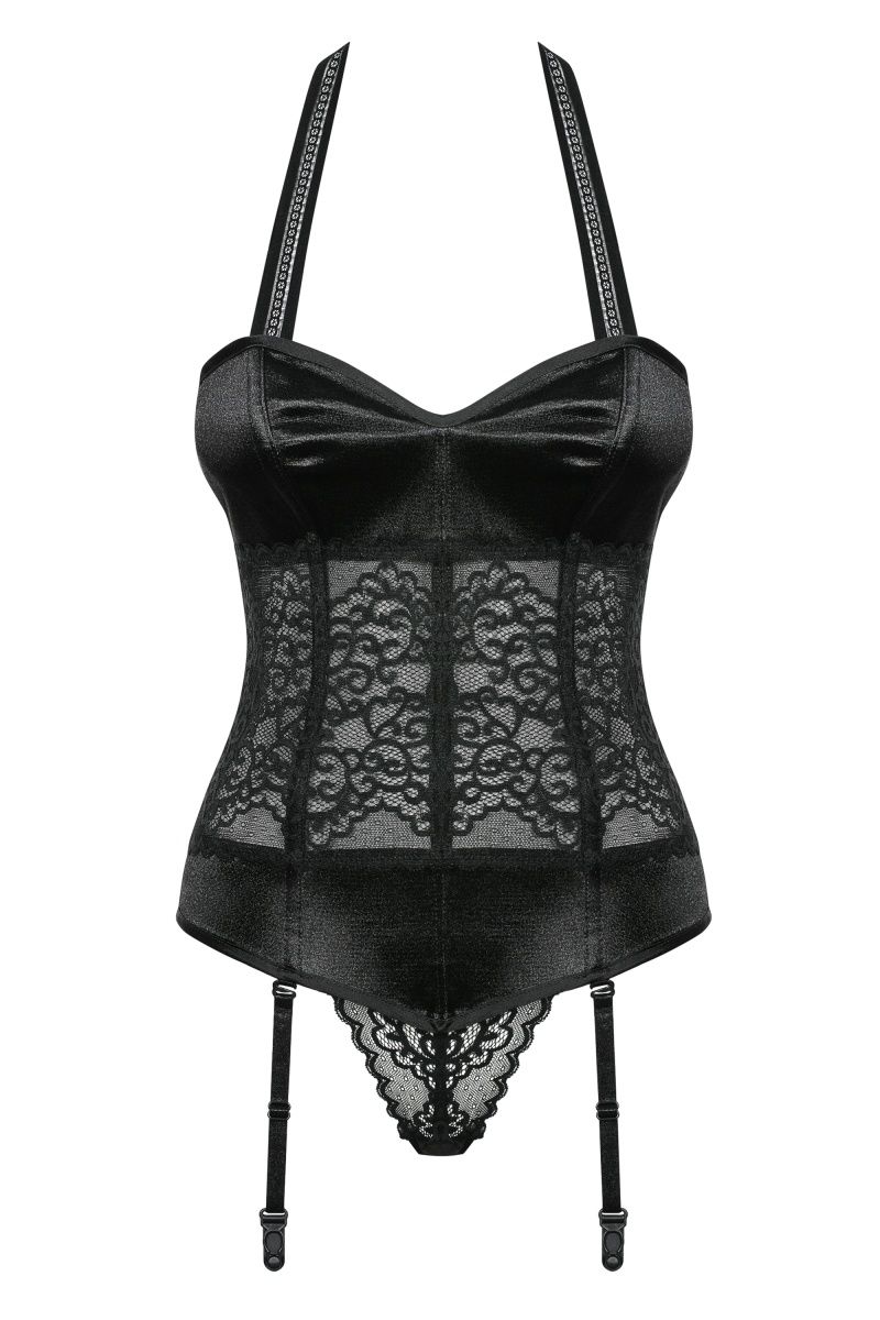 Шикарный корсаж смоделирует фигуру и подчеркнет ее женственность. Чашечки корсажа изготовлены из гладкой глянцевой ткани. Съемный эластичный ремешок через шею помогает удерживать корсаж. Зоны талии и живота украшены нежным кружевом. Низ выполнен из сатина. Сзади корсаж фиксируется при помощи шнуровки. Благодаря молнии в боковом шве слева, достаточно один раз отрегулировать корсаж по фигуре, не шнуруя его каждый раз. Съемные пажи позволяют носить корсаж как с чулками, так и без них. В комплекте: корсаж и трусики-стринги.