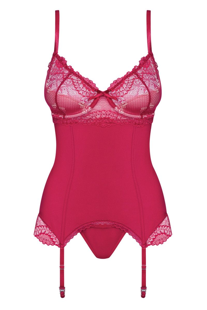 Элегантный женский корсаж, подчеркивающий фигуру. Предназначен для обладательниц пышного бюста. Чашечки на косточках с поролоном в нижней части поддерживают и приподнимают грудь. Узорчатое кружево в верхней части и ниже украшает эту модель. Между чашечками красуется атласный бантик. Сзади по всей длине атласная шнуровка. Низ корсажа украшен кружевной оборкой. Бретели и пажи для чулок регулируются по длине. В комплекте: корсаж и трусики-стринги.
