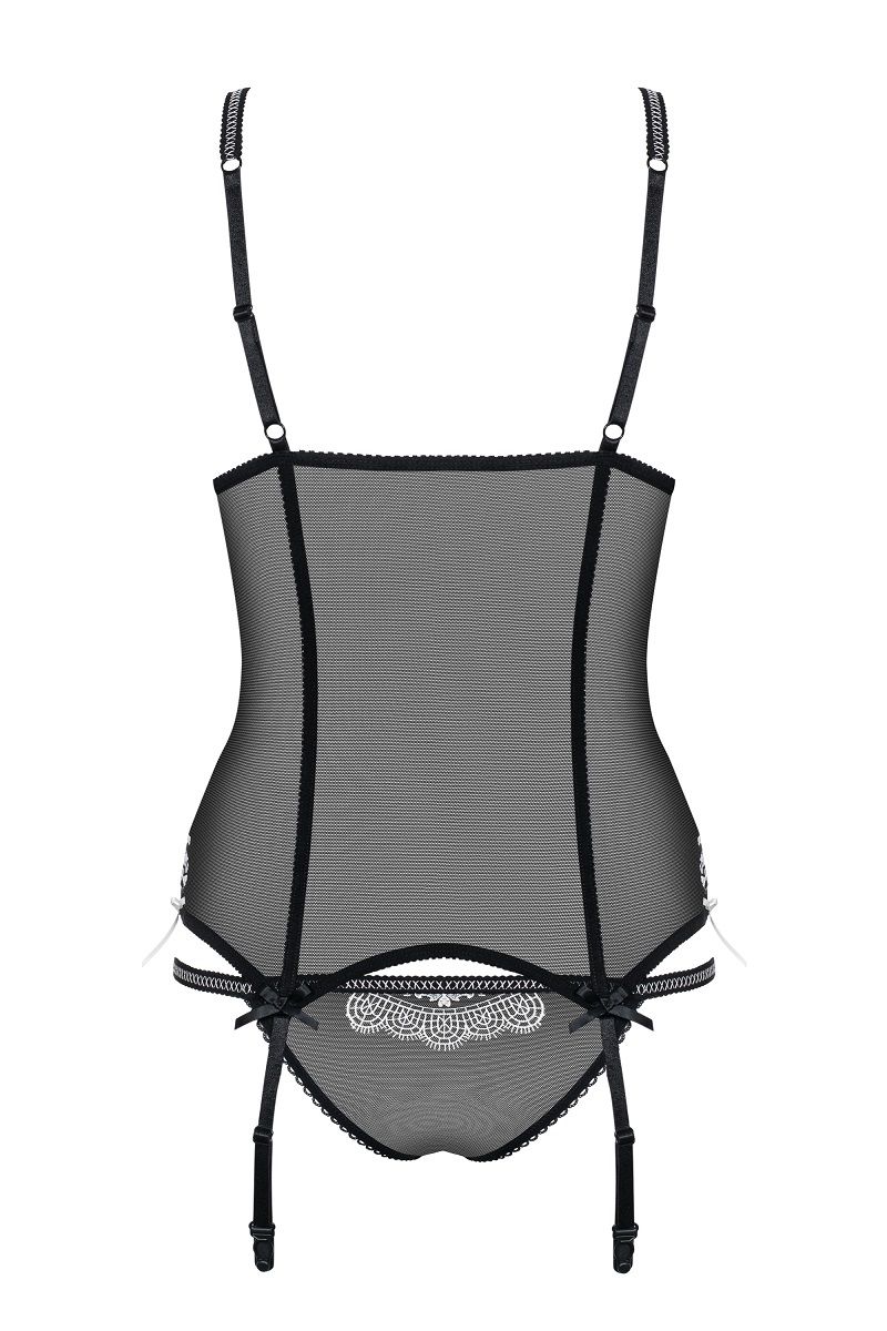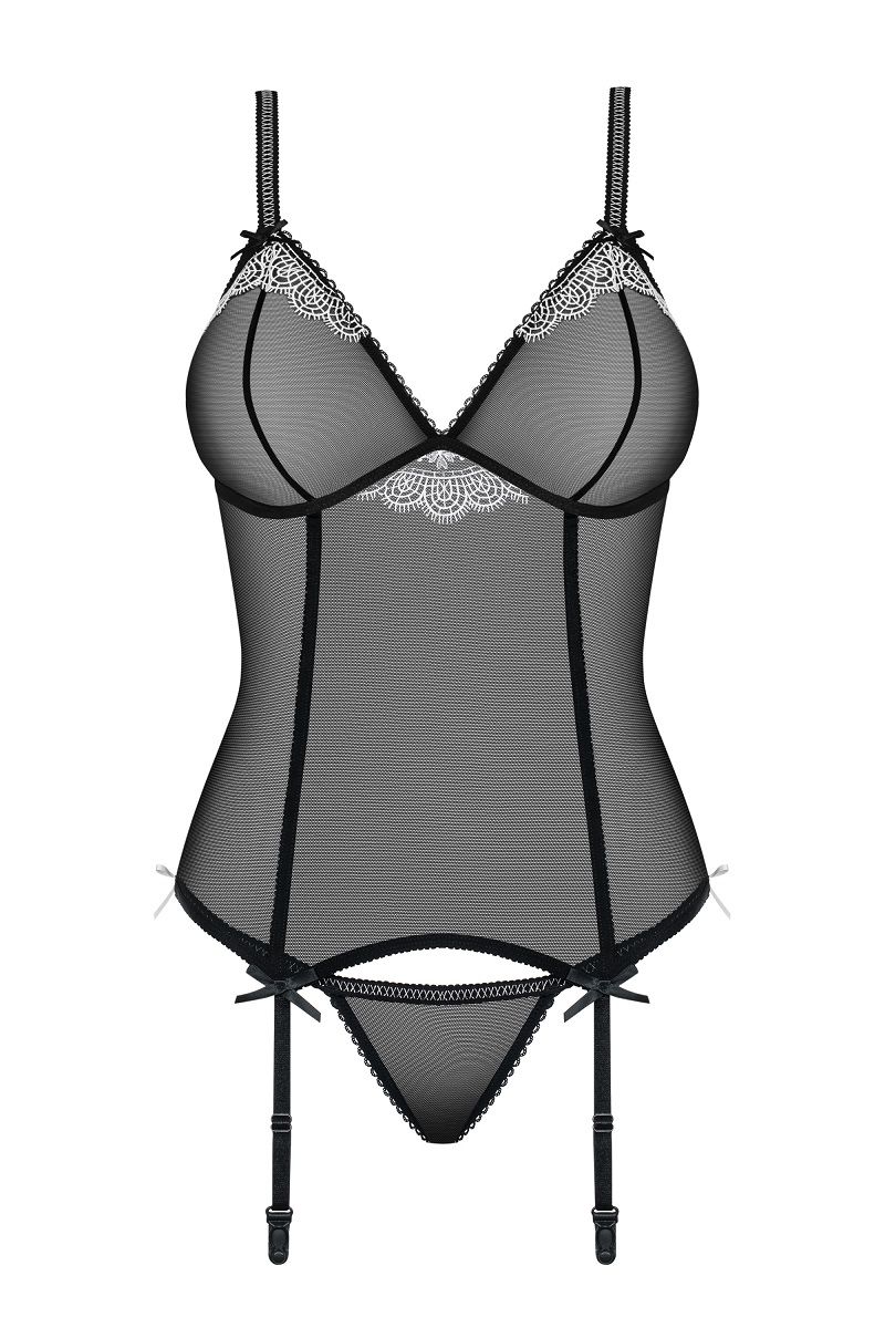 Полупрозрачный корсаж с ажурным декором и контрастной строчкой. Бретели регулируются по длине. В комплекте: корсаж, трусики-стринги.