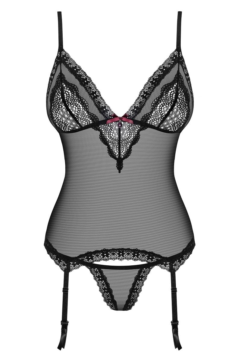 Полупрозрачный корсаж, зону декольте украшает атласный бантик с подвеской, в комплект входят трусики. В комплекте: корсаж, трусики-стринги.