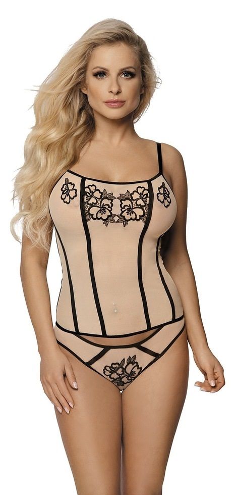 Комплект для девушки. Корсет из прозрачной вуали, декорирован вышивкой . Лиф корсета мягкий, на спине застёжка на двойной удлинитель, бретельки регулируются по длине. Трусики-бразилиана украшены вышивкой. В комплекте: корсет, трусики-бразилиана.