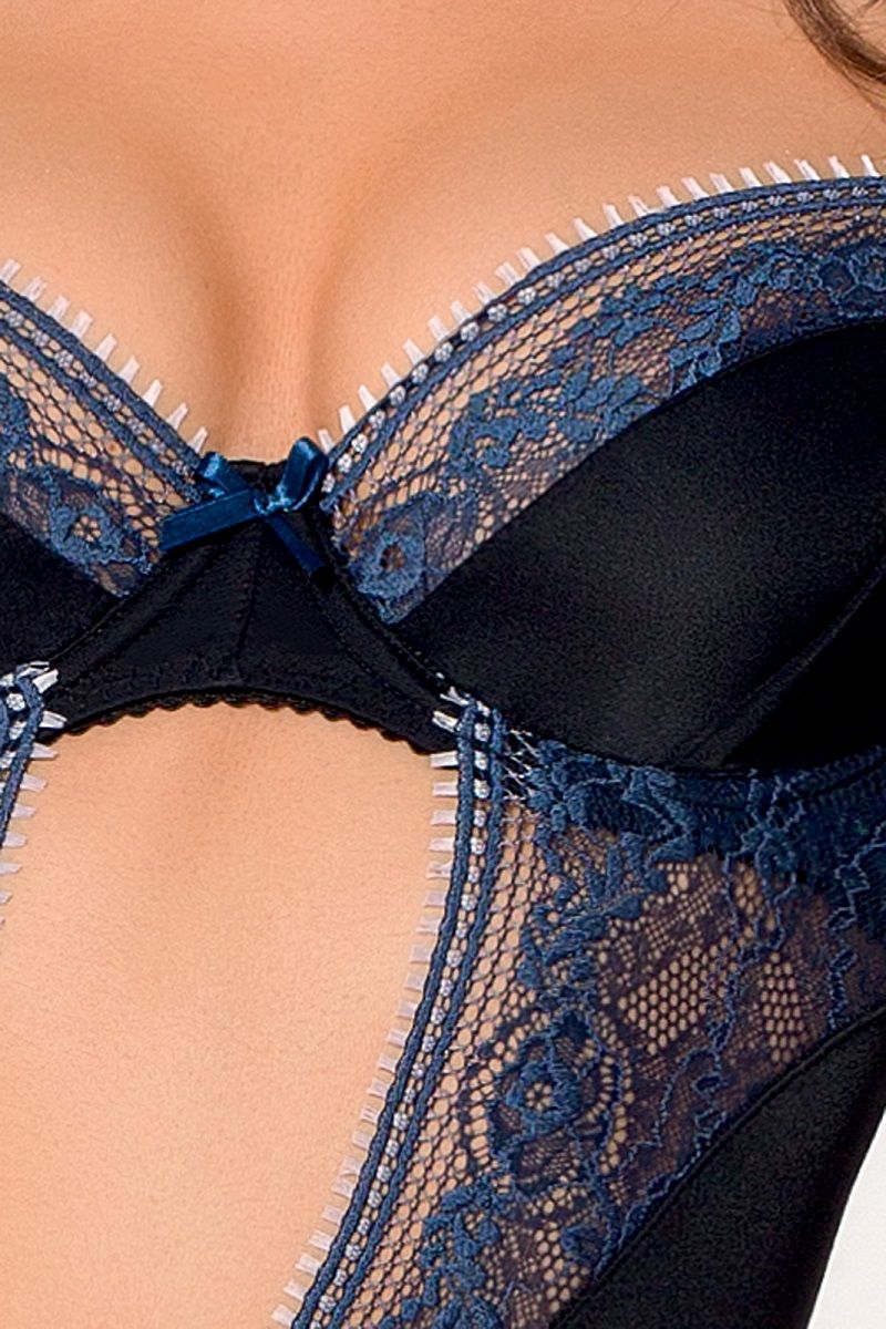Эротический корсет и трусики Gisele черного цвета, комплект декорирован мягкой сеточкой синего цвета. Корсет с подвязками для чулок, на спине застежка, бретели регулируются. Чулки в комплект не входят. В комплекте: корсаж, трусики.