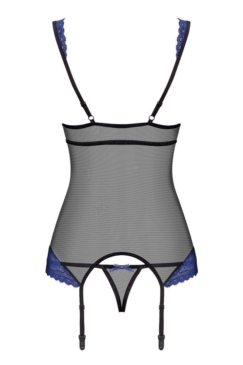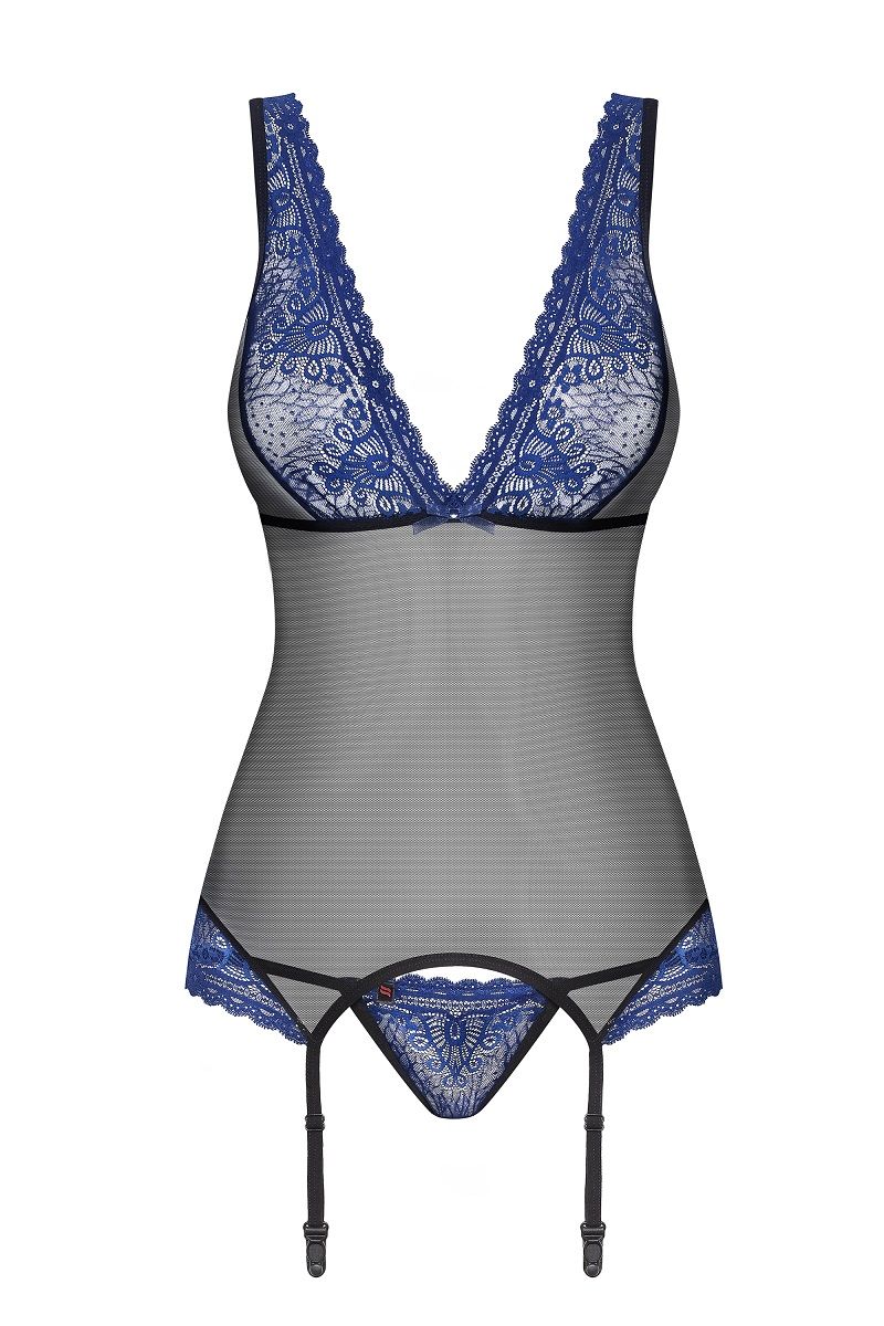 Соблазнительный полупрозрачный корсаж с синим кружевом. В комплекте: корсаж, трусики-стринги.